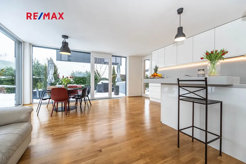 Dominantou domu je prostorný obývací pokoj (36 m2) s velkoformátovými okny a přímým vstupem na terasu a zahradu, který nabízí ničím nerušený výhled do zeleně a ideální prostor jak pro rodinný život, tak pro čas s přáteli.