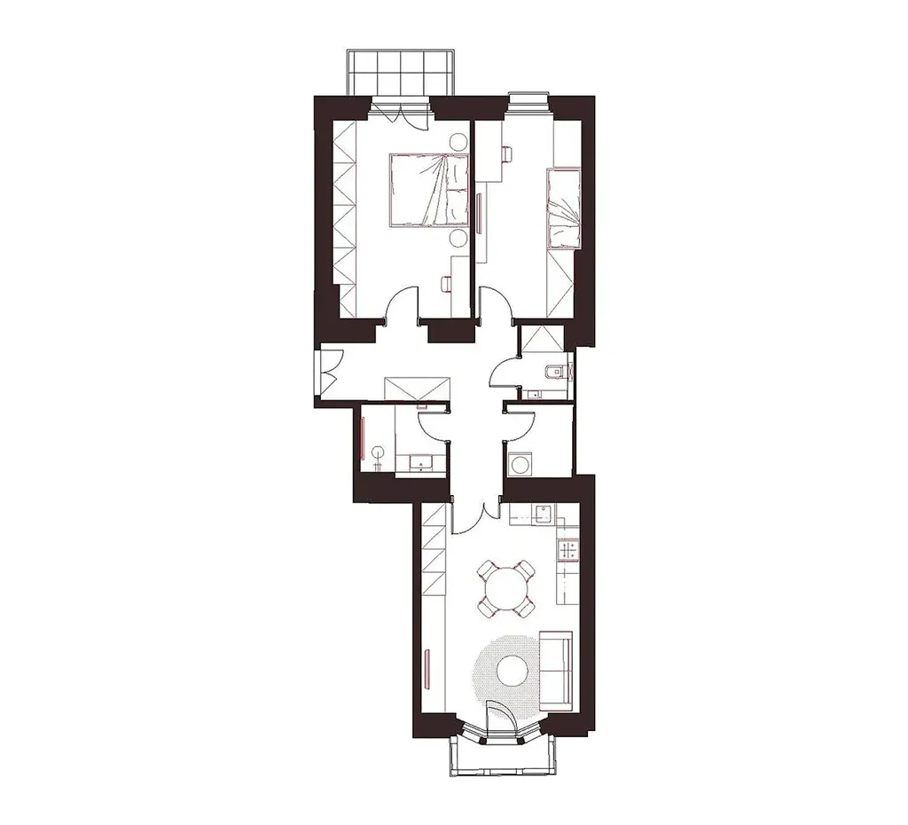 Půdorys bytu ve 3. podlaží zahrnuje velkorysý obývací pokoj s přípravou na kuchyň, dvě samostatné ložnice, prostornou vstupní chodbu, praktickou šatnu, koupelnu a toaletu. K jednotce náleží také balkon a sklepní kóje. Vybavení zahrnuje dubové podlahy, dřevěná špaletová okna s dvojsklem, elegantní interiérové dveře, koupelnu s mramorovými obklady se sanitou značek Laufen a Grohe a decentně řešená otopná tělesa a elektroinstalaci, která neruší celkový výraz interiéru. Byt bude dokončen v provedení fit out – připravený k okamžitému nastěhování.