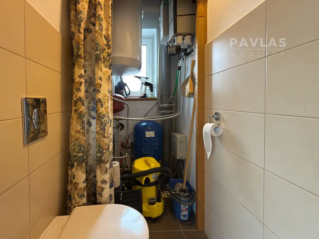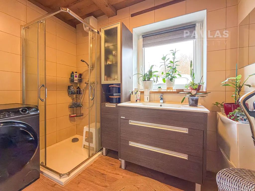 Uvnitř vás okamžitě nadchnou krásné dřevěné stropy, které celému prostoru dodávají teplo a styl. Srdcem domova je světlý obývací pokoj s kuchyní, který díky velkým francouzským oknům plynule přechází v prostornou terasu. Když se večer ochladí, stačí zapálit oheň v krbových kamnech a užívat si pohodu se svými blízkými.