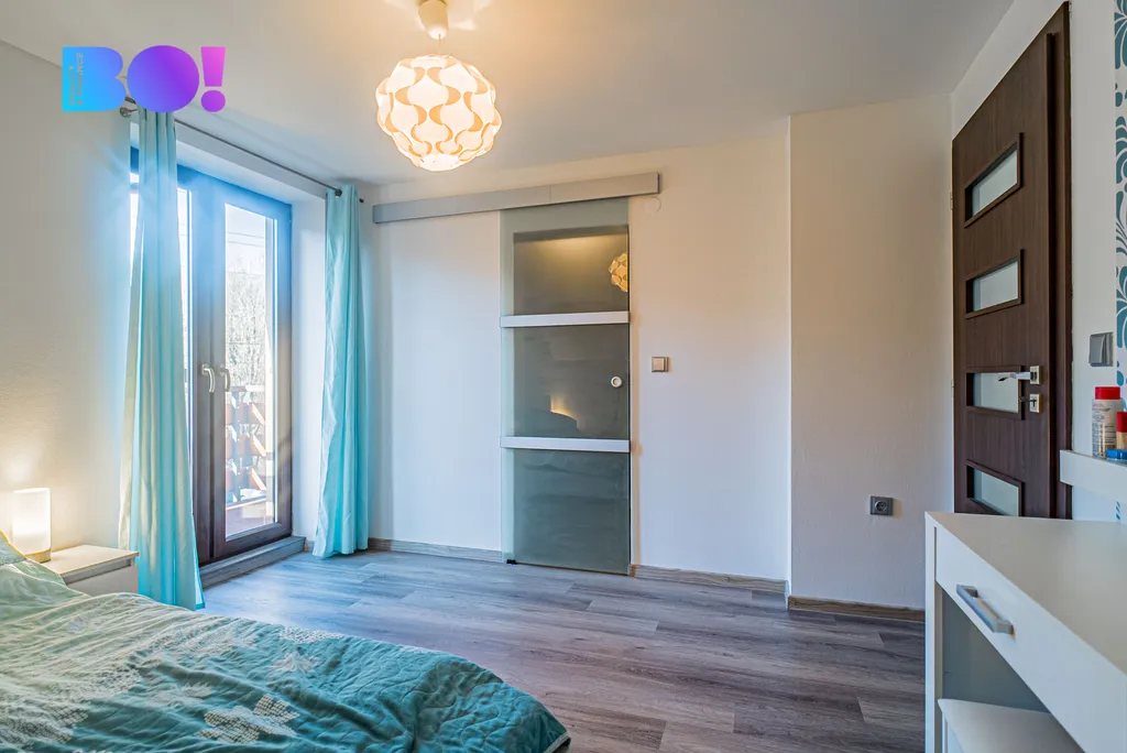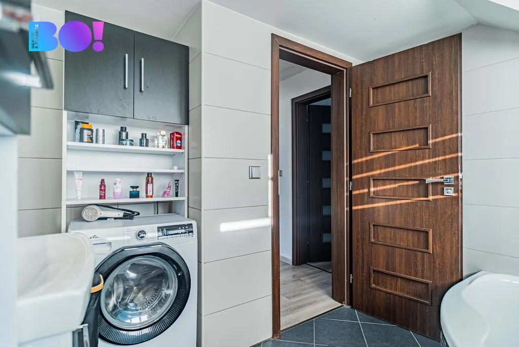 Přízemí domu tvoří prostorný obývací pokoj se vstupem na venkovní terasu, který volně navazuje na jídelní prostor a na novou moderní kuchyň. Kuchyně je kompletně vybavena spotřebiči – indukční varná deska, elektrická trouba, mikrovlnná trouba a myčka. K dispozici je také komora a samostatná toaleta. Podlahy jsou řešeny vinylovou krytinou na klik systém, v koupelně a na WC je položena dlažba. Dřevěné schodiště vede do prvního patra, kde se nacházejí dva dětské pokoje – každý s vlastním balkonem, ložnice se šatnou a balkonem a další pokoj vhodný jako pokoj pro hosty, pracovna nebo budoucí koupelna (příprava je hotová).