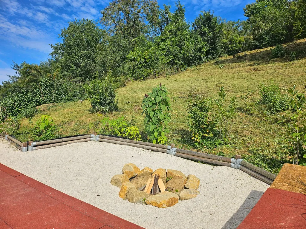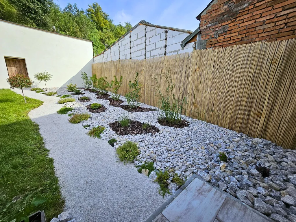 část ve svahu (450 m²) – upravená s kamennými prvky, výsadbou a prostorem pro odpočinek