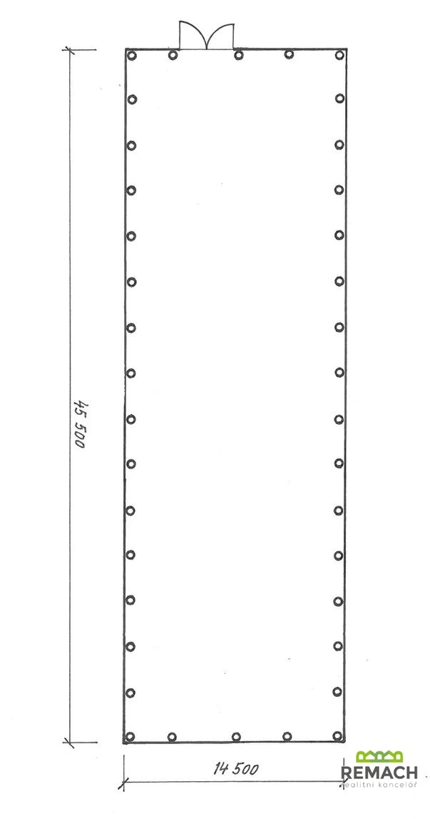 Sklad má rozměry přibližně 45,5 × 14,5 m, nabízí velkorysou plochu a světlou výšku stropu cca 5,5 m, což umožňuje efektivní využití prostoru i pro regálové systémy nebo manipulaci s objemnějším materiálem.