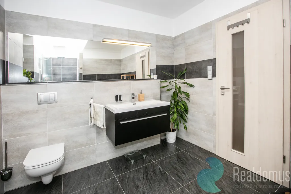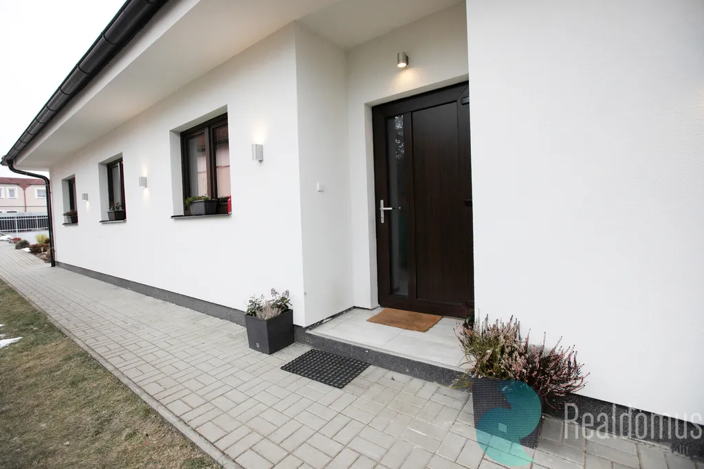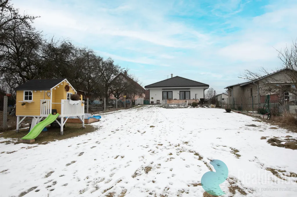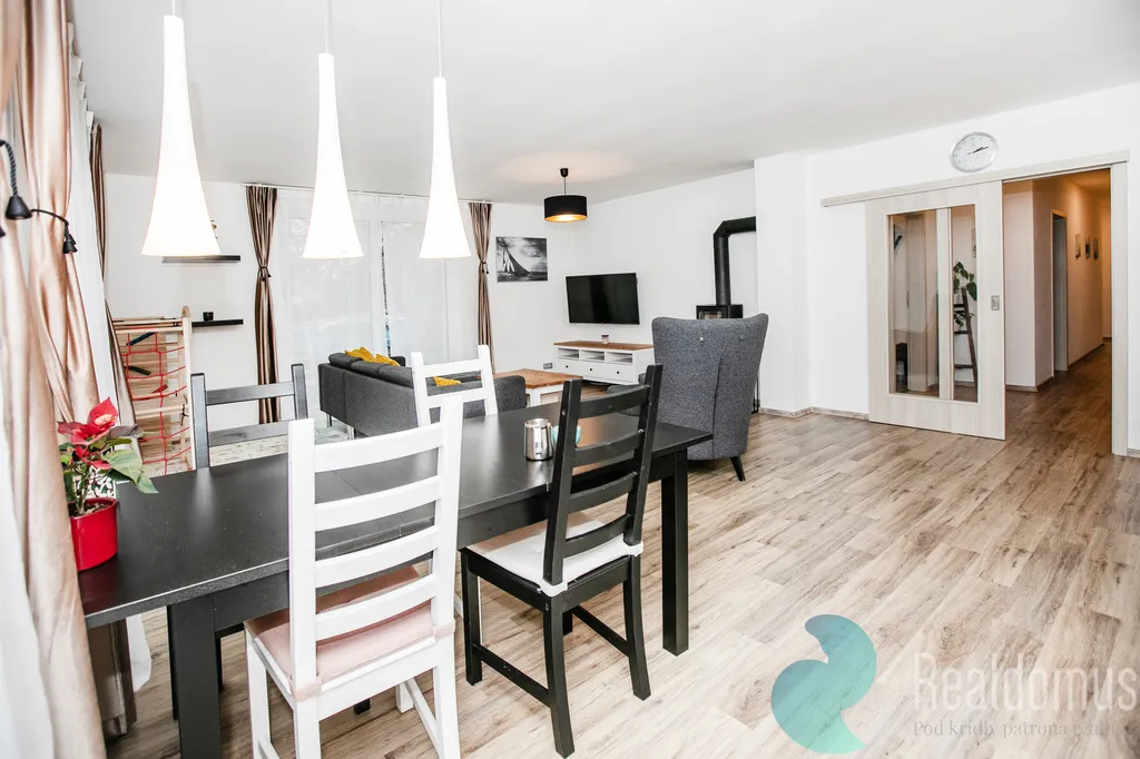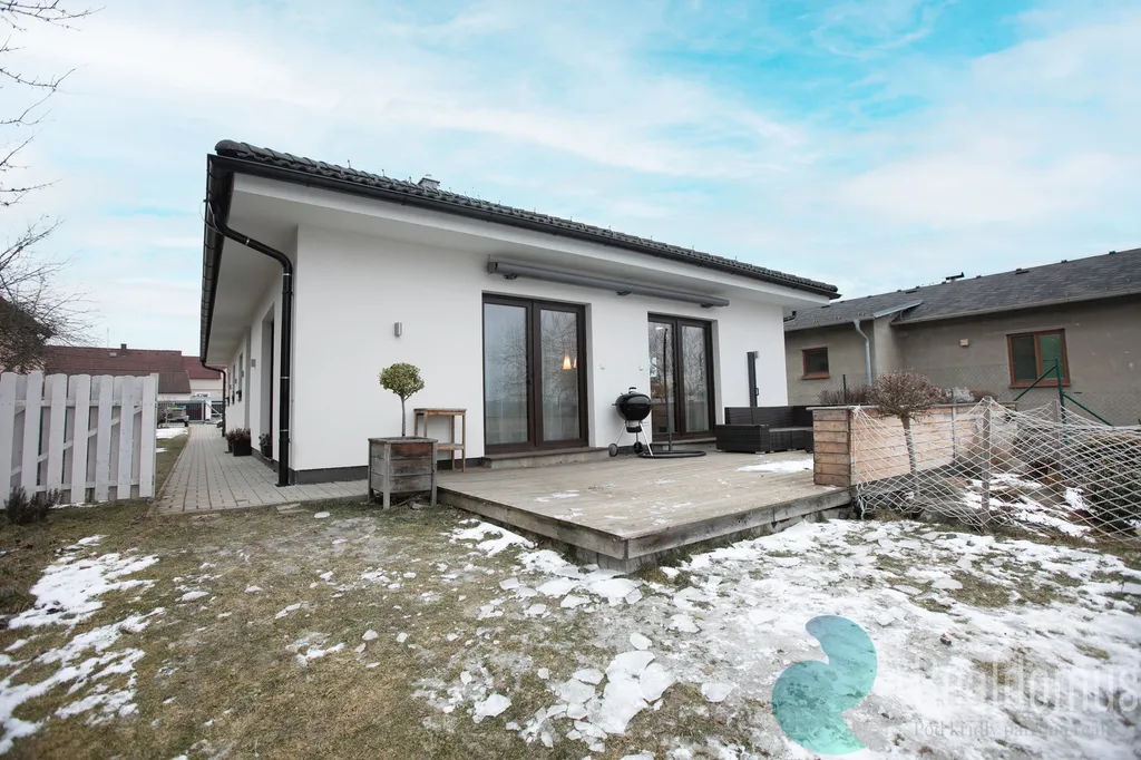 Hned po vstupu do zádveří odložíte kabáty a boty a projdete do chodby s praktickým samostatným WC. Srdcem domu je světlý obývací pokoj s moderní, plně vybavenou kuchyní, kde se bude odehrávat většina rodinných chvil. V zimě doplní atmosféru krbová kamna, v létě si vychutnáte kávu nebo grilování na terase (35m²) s výhledem do rozlehlé zahrady. u terasy s markýzou na ovládání se nachází skalka s jezírkem.