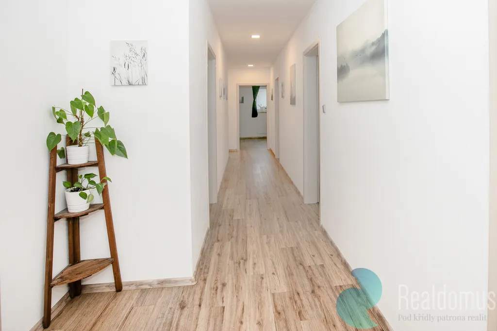 Z centrální chodby se dostanete do pracovny (11,5 m²) – ideální pro home office nebo pokoj pro hosty. Dále do prostorné koupelny (9 m²) s vanou, sprchovým koutem a WC, Klidný spánek budet mít v ložnici (16 m²).