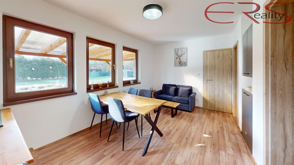 Chata má zastavěnou plochu cca 57 m² a dispozici 3+kk: obytný prostor s kuchyňským koutem + 2 ložnice, koupelna s WC a krytá terasa. Objekt je zateplený a vytápěný, takže celoroční využití není jen marketingová pohádka.