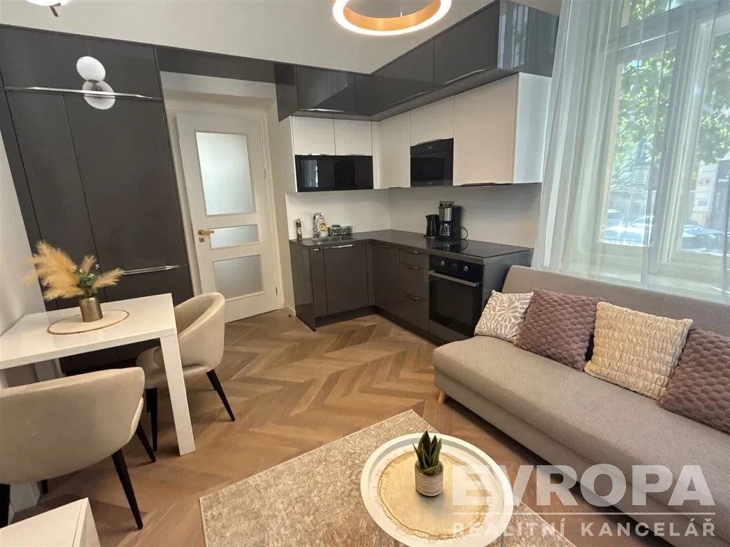 Cozy fully equipped apartment with a terrace at prestigious address in the center of Prague with dispositions 2+kk and size 39 m2. Living room with kitchenette, set of dishes, kettle and coffee maker. In the living area there is a sofa bed for third guest, big TV and WiFi. In the bedroom there is a queen size bed including bed linen. In the bathroom there is a walkin shower. Perfect civic amenities, cafes, shops, metro, tram nearby. Quiet location only a few minutes from center. Monthly rent is 29.000 CZK + utilities, deposit in amount of one month rent, commission in amount of one month rent. Call broker for more information.