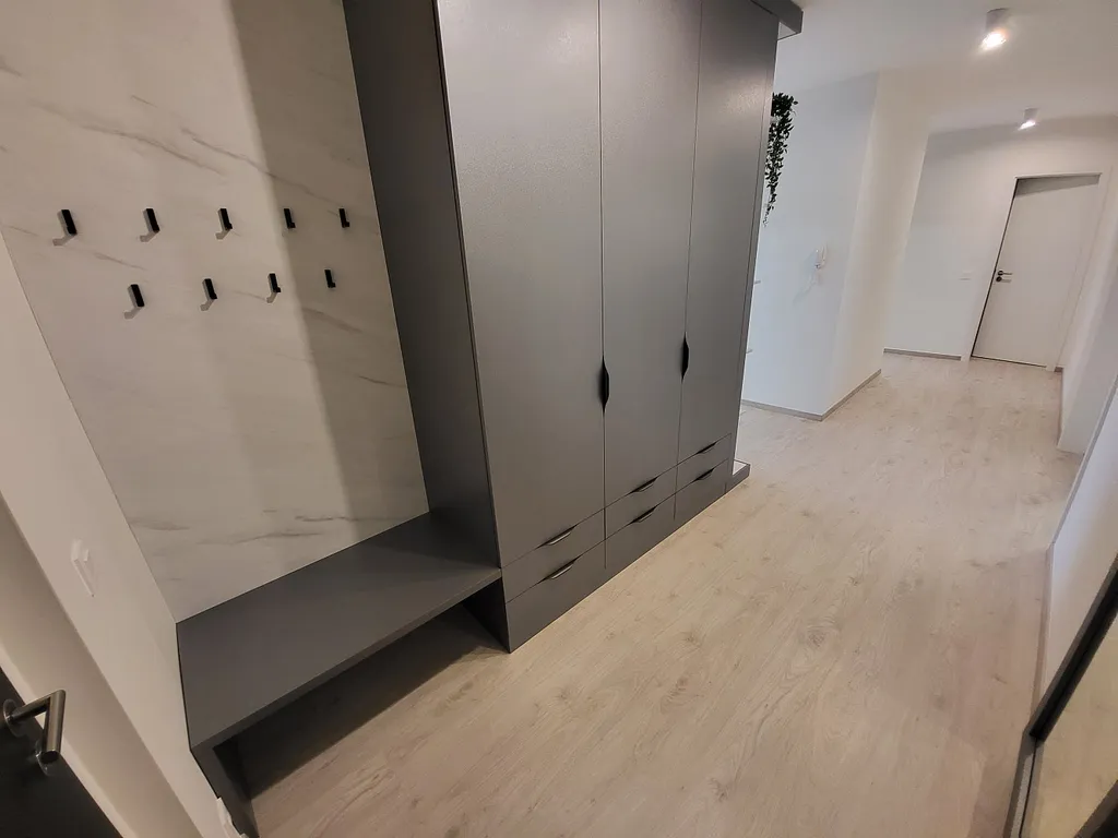 V rezidenci Nová Karolina nabízíme k pronájmu zařízený nadstandardní byt 4+kk se dvěma lodžiemi, garážovým stáním a skladem. Byt se nachází ve 3. NP a disponuje neprůchozími pokoji, které jsou zařízeny nábytkem na míru. V ložnici je vestavná skříň, komoda a dvoulůžková postel s matracemi a nočními stolky. V dětském pokoji je jednolůžková postel, skříně, psací stůl a vstup na lodžii orientovanou severozápadním směrem. Kuchyňská linka je vybavena sklokeramickou varnou deskou s digestoří, vestavnou lednicí, mrazákem, horkovzdušnou a mikrovlnnou troubou, myčkou nádobí a mycím dřezem. V obývací části je jídelní stůl s čalouněnými židlemi, rohová pohovka se stolkem a obývací stěna. V obývacím pokoji je dále výstup na druhou lodžii orientovanou do klidovém zóny. V koupelně je vana, topný žebřík, dvě umyvadla a toaleta. Druhá toaleta s umyvadlem je samostatně. Na chodbě jsou šatní skříně, botník a odkládací stěna. Pračka je umístěna v komoře, která skýtá další úložné prostory. K bytu náleží jedno garážové parkovací stání s praktickým skladem. Do garáže je vjezd vraty na dálkové ovládání. Veškerá občanská vybavenost v bezprostřední blízkosti. Pro více informací o této nemovitosti nebo sjednání prohlídky nás prosím kontaktujte nebo vyplňte níže uvedený formulář, rádi Vám pomůžeme.