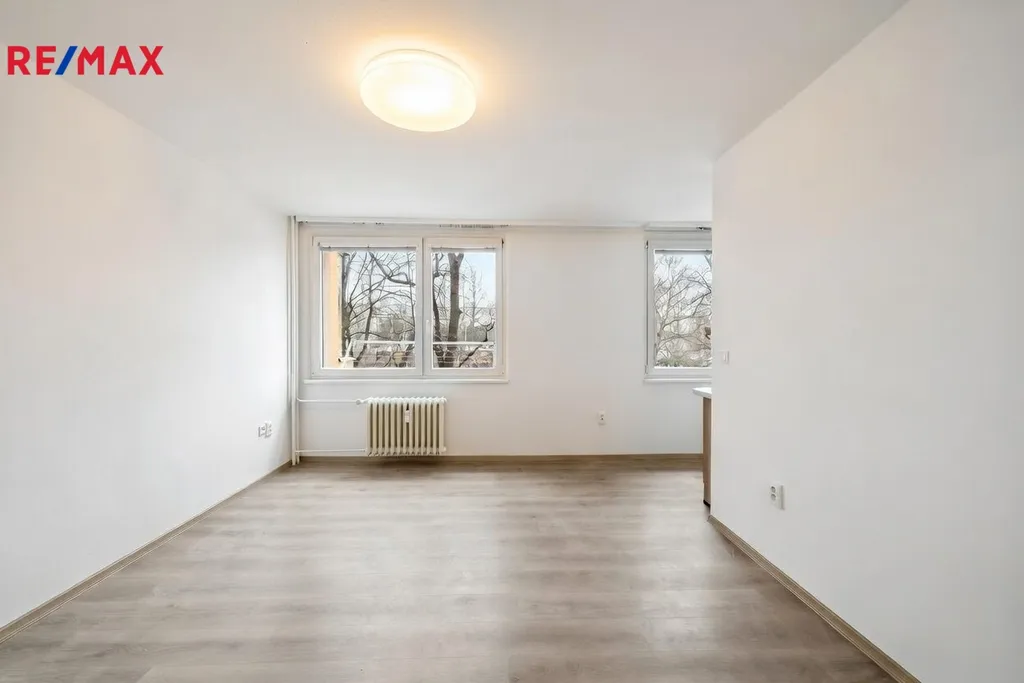 Byt je situován ve 2. patře bytového domu bez výtahu a je nabízen nezařízený. Dispozičně se skládá z předsíně s praktickou vestavěnou skříní a věšákem, obytného prostoru s kuchyňským koutem, koupelny se sprchovým koutem a toaletou a sklepní kóje.