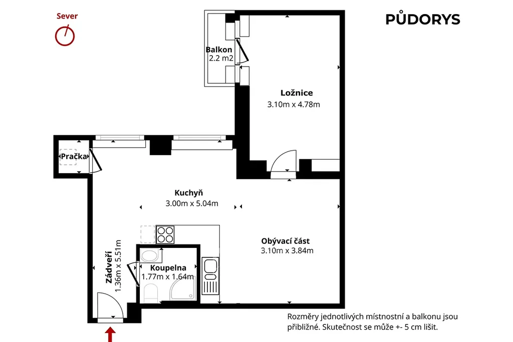 Okna ložnice jsou orientovaná na jihozápad, okna obývacího pokoje s kuchyňským koutem na severozápad.