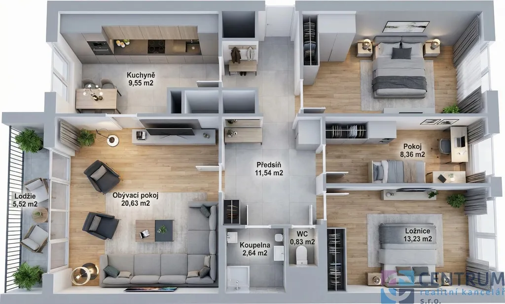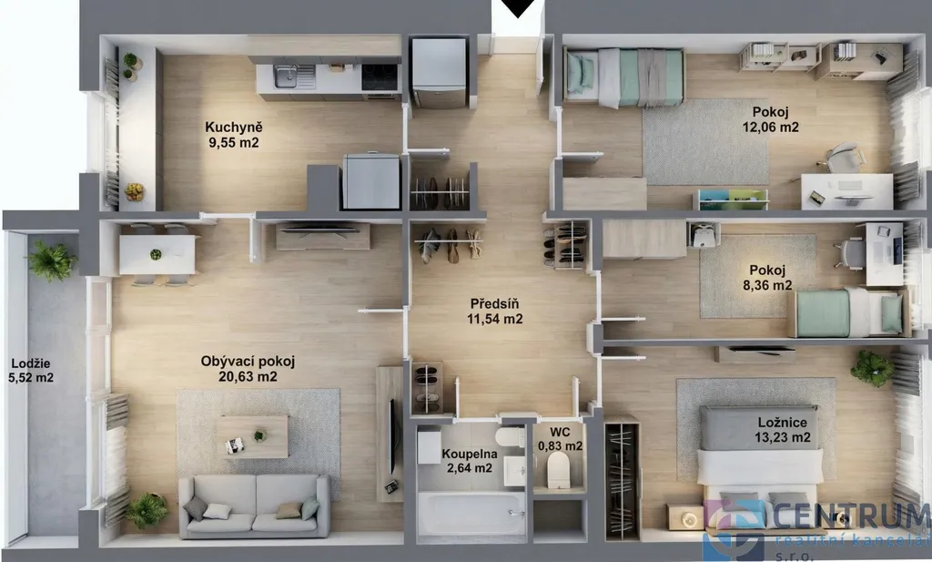 Z obývacího pokoje je vstup na prostornou lodžii o velikosti 5,5 m.