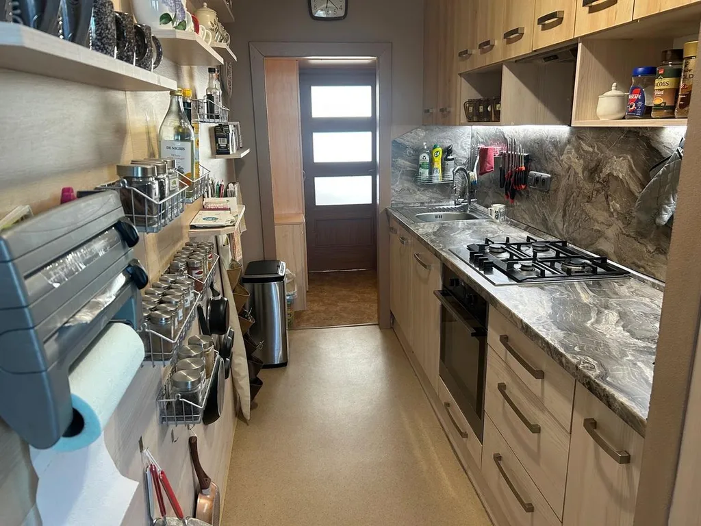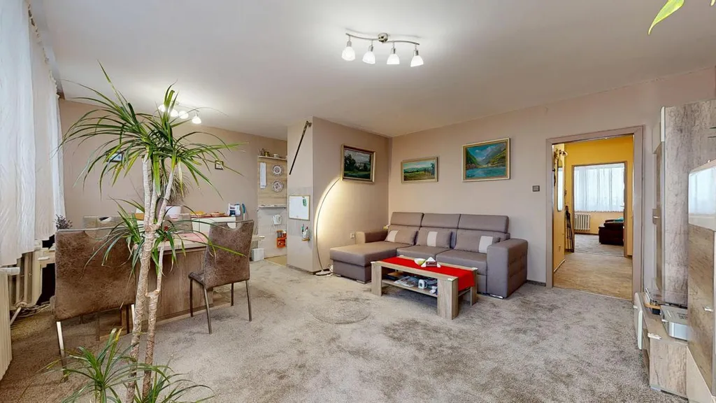 Byt prošel před 5 lety rekonstrukcí a prodává se ve výborném, udržovaném stavu. Dominantní orientací oken je východ (obývací pokoj s lodžií) a západ (dětský pokoj, ložnice). Centrální částí bytu je prostorný obývací pokoj s kuchyňským koutem a přímým vstupem na zasklenou lodžii. Kuchyňská linka je plně vybavena vestavěnými spotřebiči (plynový sporák s horkovzdušnou elektrickou troubou, myčka na nádobí, čistička vody Zepter, mikrovlnná trouba).