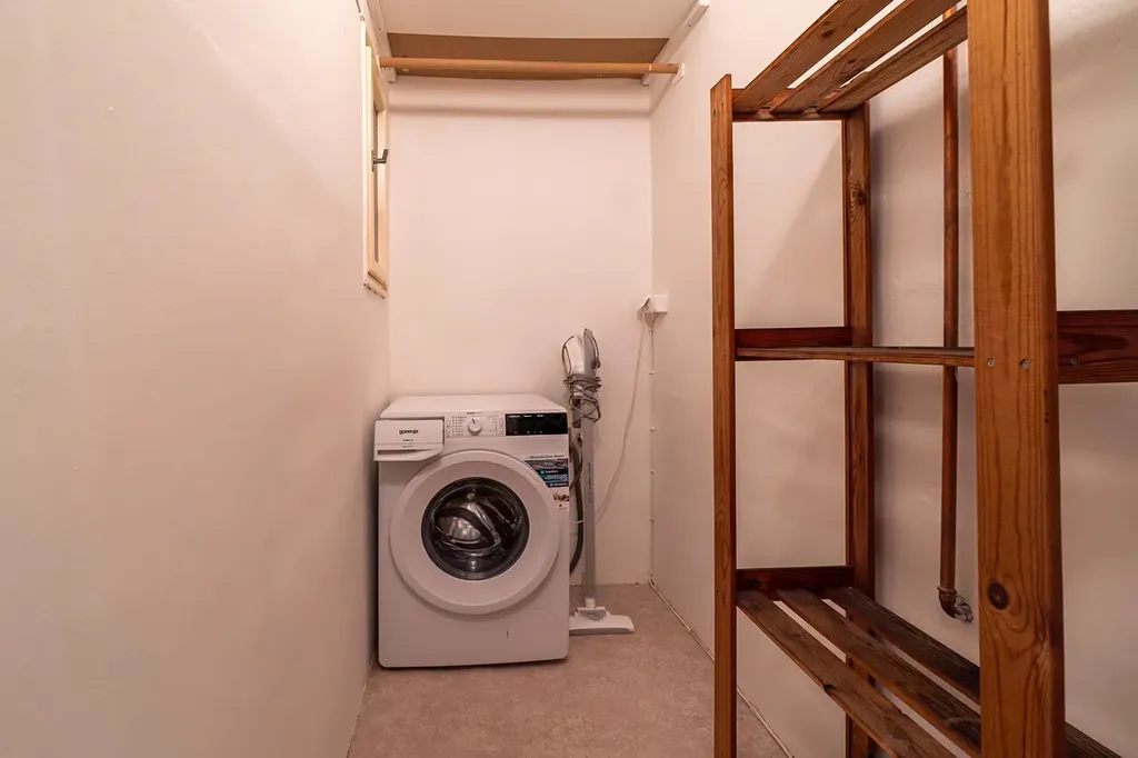 Koupelna vybavená vanou a umývadlem. WC samostatné. Komora s pračkou a úložnými prostory.