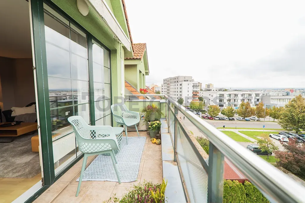 Dispozice bytu nabízí prostorný obývací pokoj s kuchyňským koutem a přímým vstupem na terasu s otevřeným výhledem, dva samostatné pokoje (ložnice a pracovna), koupelnu se sprchovým koutem a toaletou a vstupní chodbu s úložnými prostory. V obývacím pokoji je instalována klimatizace, která zajišťuje komfort i během letních měsíců. K bytu náleží sklepní kóje.