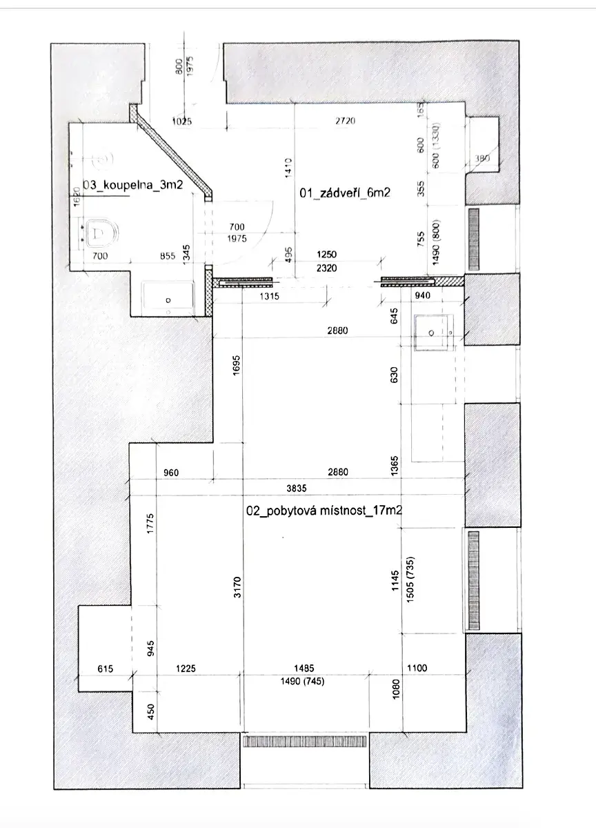 Z chodby je vstup do koupelny se sprchovým koutem a WC a zároveň do hlavního pokoje širokými posuvnými dveřmi.