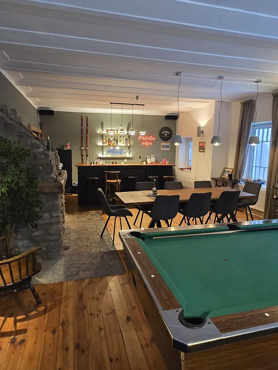 Na stejném podlaží je prostorná společenská místnost s barem, krbem, velkým stolem a kulečníkem — ideální pro setkávání a volný čas.