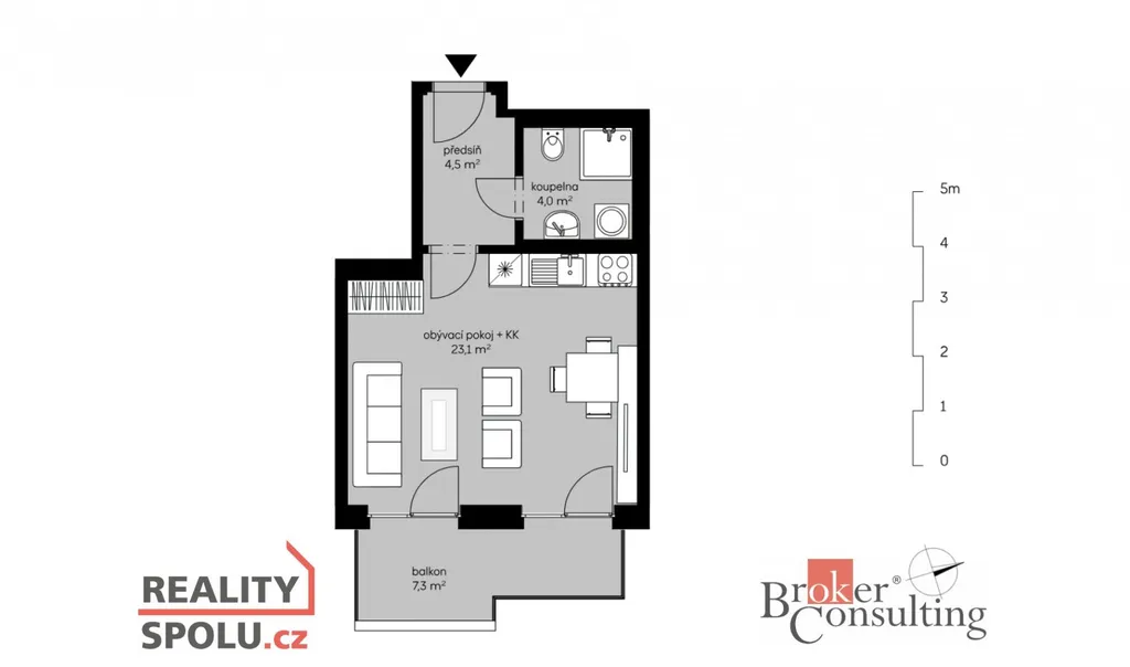 Dispozice bytu zahrnuje předsíň, koupelnu a obývací pokoj s kuchyňským koutem a přímým vstupem na prostorný balkón (7,3 m²), který nabízí příjemné místo k odpočinku. Kuchyňský kout je vybaven moderní kuchyňskou linkou včetně lednice s mrazákem, horkovzdušné trouby, indukční varné desky, mikrovlnné trouby a digestoře. Komfort bydlení zvyšují také elektricky ovládané venkovní žaluzie, které zajišťují soukromí, regulaci světla i tepelný komfort během celého roku.
