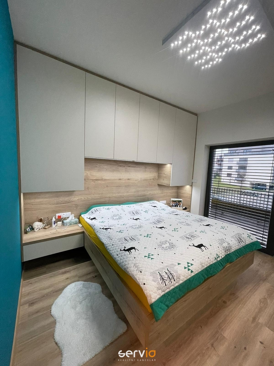 Ložnice má kompletní vestavný nábytek, nebudou v ní zůstávat jen matrace, jinak vše. Postele mají polohovatelné rošty manuálně a je pod nimi úložný prostor. Ložnice má klimatizaci zn. Samsung. Z ložnice vstup na balkon cca 8 m2.