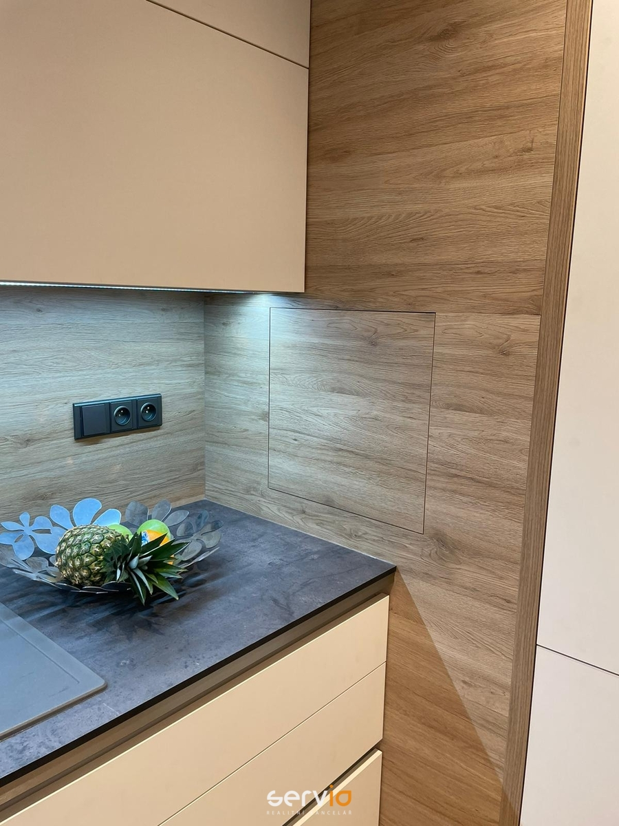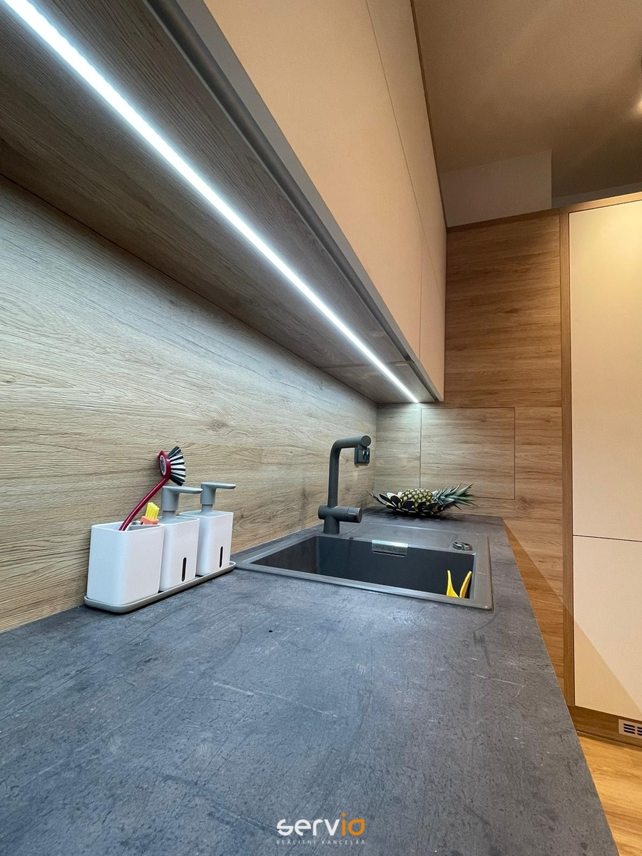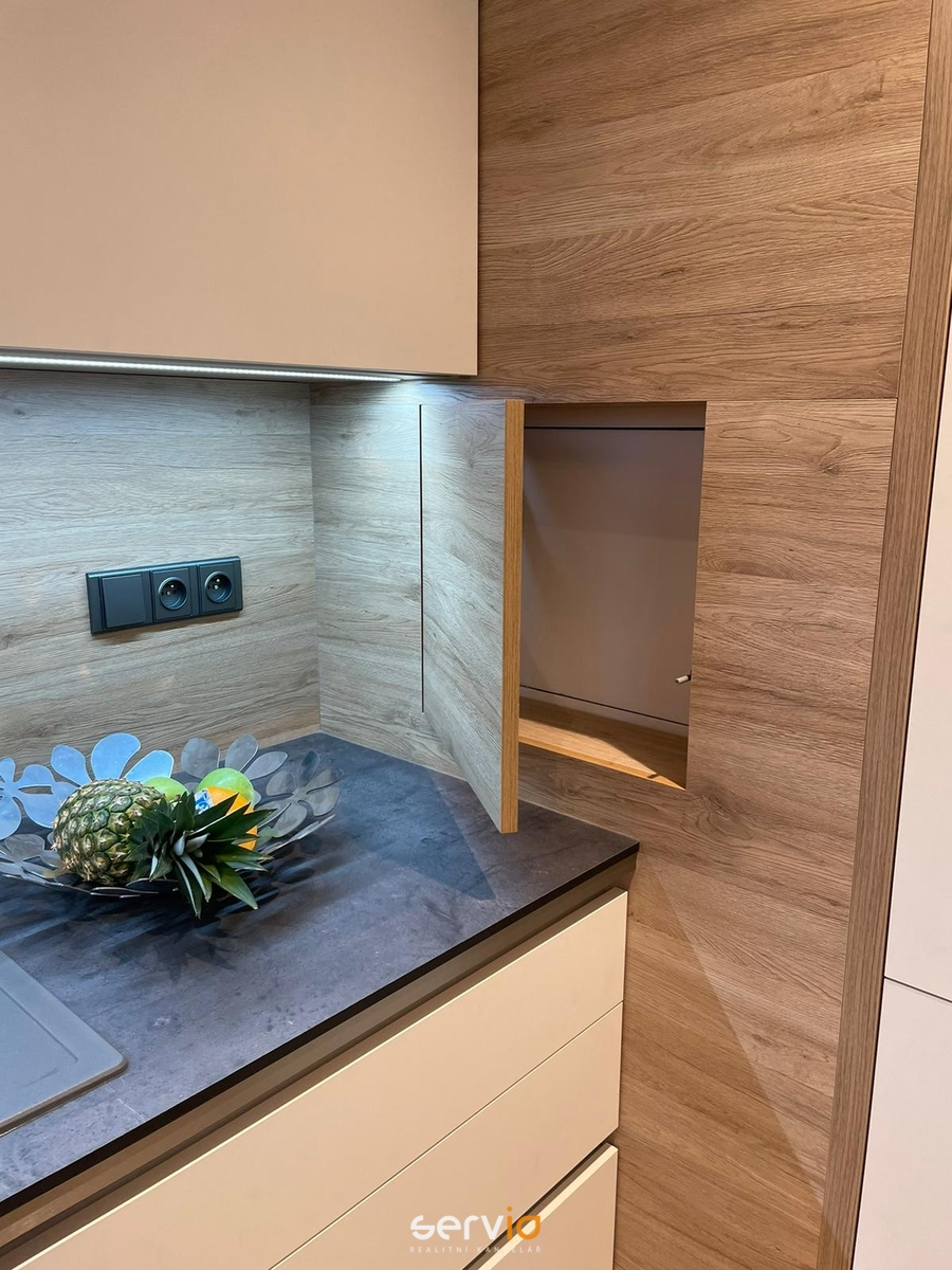 Obývák s kuchyní má taky z velké části vestavný nábytek - obyváková stěna, kuchyň má všechny spotřebiče kromě kávovaru Delonghi vestavné, ten je na výsuvné skříňce. Nebude zůstávat gauč a stůl se židlemi na fotce, ale budou nahrazeny jinými. Spotřebiče značky Siemens (parní trouba, vestavná mikrovlnka, indukce, myčka s otevíráním dveří po domytí), lednice Whirpool, dřez Schoke, klimatizace zn. Samsung. Z obýváku je vstup na balkon (cca 8 m2) a na velkou terasu (cca 50 m2), která nabízí výhled na Petrov.