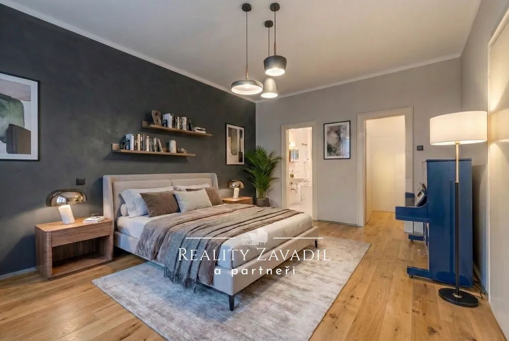 Byt disponuje velkorysou dispozicí s prostornými pokoji, jídelnou, koupelnou, samostatnou toaletou a menším pokojem, který dříve sloužil jako pokoj pro služebnictvo. Výhodou jsou vysoké stropy a původní dřevěné parkety, které po přebroušení získají opět vzhled nových podlah.