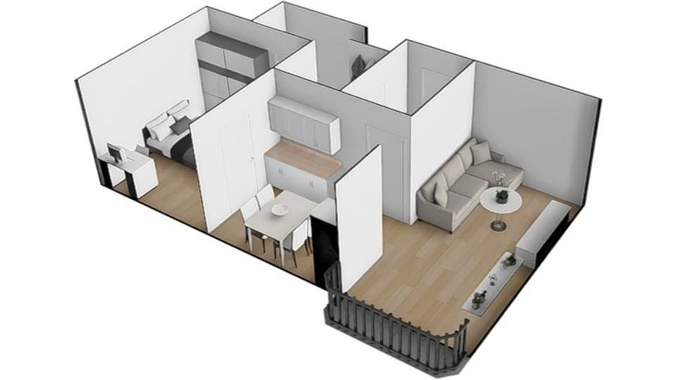 Vchodovými dveřmi vstoupíme do předsíně. Po pravé straně máme vchod do koupelny s masážní vanou, sprchovým koutem a WC. Dále se dostáváme do prostorného obývacího pokoje s kuchyňskou linkou a jídelním stolem. Kuchyňská linka disponuje plynovou varnou deskou, elektrickou troubou, digestoří, ledničkou s mrazničkou, pračkou a mikrovlnnou troubou. V obývacím pokoji se nachází relaxační křeslo s podnožkou a stolkem. Dále je odsud vstup na balkón s výhledem na Slatinu. V neposlední řadě nalezneme za obývacím pokojem ložnici s vestavěnou skříní. Ložnice je průchozí do koupelny a je vybavená masivním dvoulůžkem. Bytová jednotka je orientovaná na východ.