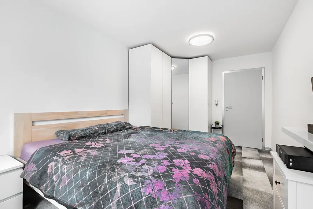 Byt nabízí velkorysý obývací prostor s kuchyňským koutem, který tvoří přirozené centrum bydlení. Moderní kuchyňská linka má dostatek úložného prostoru s vestavěnými spotřebiči.