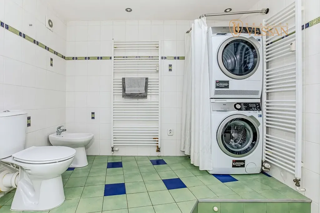 Velká koupelna (10,2 m²) nabízí vanu, WC, bidet, pračku i sušičku. V bytě jsou plastová okna a vinylové podlahy. Na balkoně jsou markýzy s dálkovým ovládáním pro pohodlné stínění v létě. Vytápění je řešeno plynovou kotelnou v domě.