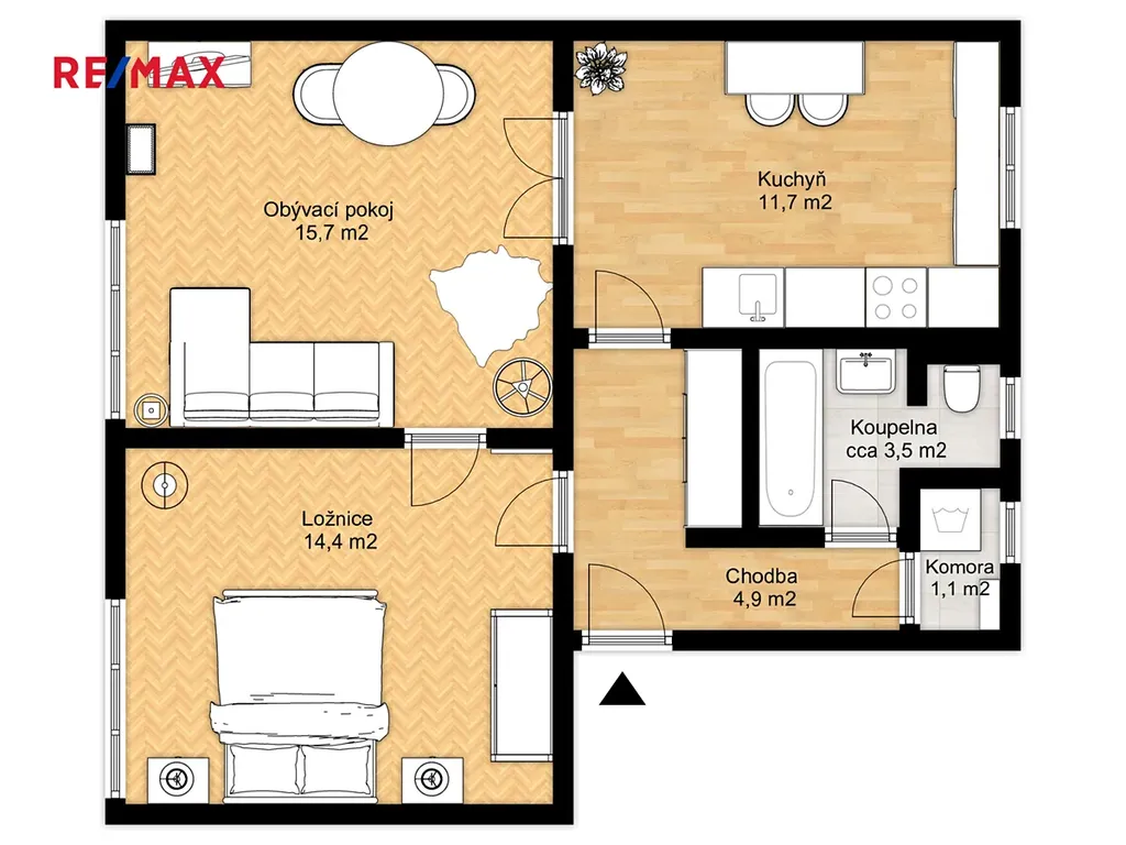 Byt je částečně vybaven a k dispozici je prostorná sklepní kóje.