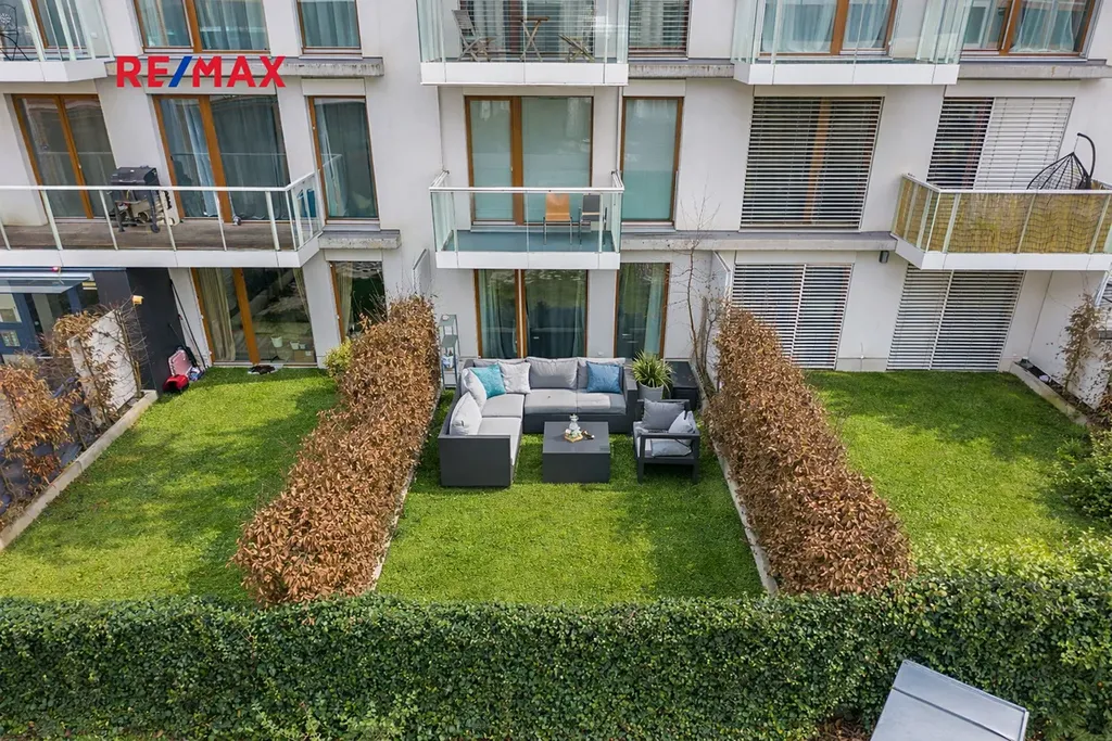Byt je plně vybavený a připravený k okamžitému nastěhování. Součástí je kuchyňská linka se spotřebiči, vestavěné skříně na míru a dostatek úložného prostoru. Komfort bydlení doplňují masivní dřevěné podlahy, bezpečnostní vstupní dveře, elektricky ovládané předokenní žaluzie a rozkládací sedací souprava vhodná pro příležitostné přespání hostů. Díky velkým oknům je byt velmi světlý a nabízí dostatek denního světla po celý den. Z obytné části je přímý vstup na zahradu, která poskytuje ideální prostor pro relaxaci, posezení nebo opalování.