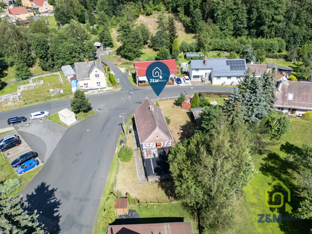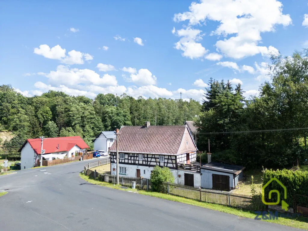 Volně stojící objekt obdélného půdorysu s celým patrem a štítem hrázděným. Střecha je sedlová, krytá eternitovými šablonami. Hlavní průčelí je v přízemí s jedním novodobým, trojdílným oknem uloženým ve špaletě, dvěma vstupy bez dveřních rámů a malým oknem mezi nimi. První vstup umístěn na ose domu je prostý s kovovými dveřmi s viditelným nýtováním. Druhý, pravý vstup vedoucí do hospodářské části domu je také prostý, dveře jsou kovové, s viditelným nýtováním a původním kováním. Nad nimi je nízký světlík členěný na tři obdélníková pole, osazen skly přímo do zdiva bez rámu. První patro má tři okenní osy s obdélnými lícujícími okny, otevíravími ven, z čehož první okno je čtvercové, dělené v horní polovině. Štítové průčelí s má dvě nesouměrné okenní osy. V přízemí jsou dvě novodobá, obdélná okna uložená ve špaletě. V prvním patře jsou okna dvoukřídlá, nesouměrně uložená na osu domu. V podkrovním patře jsou okna téměř čtvercová, jednokřídlá. Ve vrcholu štítu je jedno malé jednokřídlé okno. Okna celého objektu se postupně, po patrech zmenšují směrem k hřebeni. Malé okno mezi vstupy a okna v hrázděné části objektu jsou lícující, otevíravá ven. K zadnímu štítovému průčelí jsou přistaveny dvě garáže, z čehož první slouží též jako terasa. Vstup na ní, opatřený stříškou, je z prvního, hrázděného patra objektu. Štít je tu krytý eternitovými šablonami. K nemovitosti dále náleží venkovní pergola, mobilní i zděná garáž a lze jí napojit na všechny sítě. (plyn a kanalizace na hranici pozemku).Nemovitost se nachází v klidné části obce. Jedná se o velmi dobrou nabídku a lze jí využívat jak k trvalému bydlení tak ke komerčnímu využití(penzion)