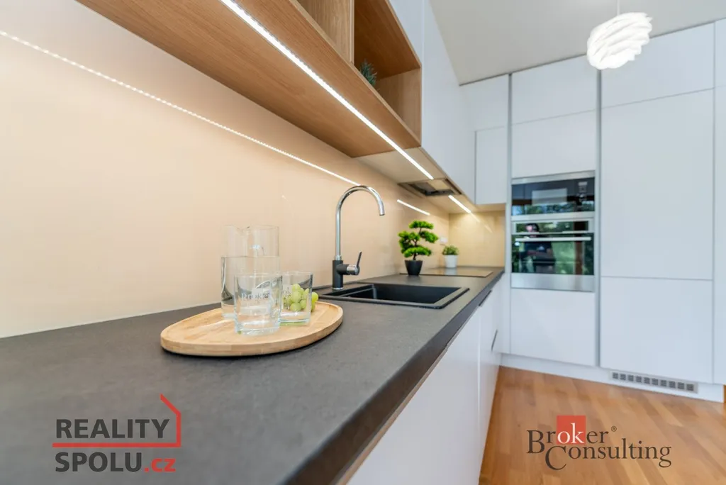 Byt je vkusně a částečně zařízen. V obývacím pokoji se nachází velká francouzská okna, která zajišťují dostatek denního světla a nabízejí příjemný výhled. Obývací část je propojena s plně vybavenou kuchyňskou linkou s vestavěnými spotřebiči. Dále je k dispozici ložnice s na míru vyrobenou šatní skříní, další pokoj vhodný jako dětský pokoj, pracovna nebo druhá ložnice, prostorná vstupní hala s komorou a dostatkem úložných prostor, koupelna s vanou a dvě toalety. Byt je klimatizován, což zajišťuje komfortní bydlení i během letních měsíců.