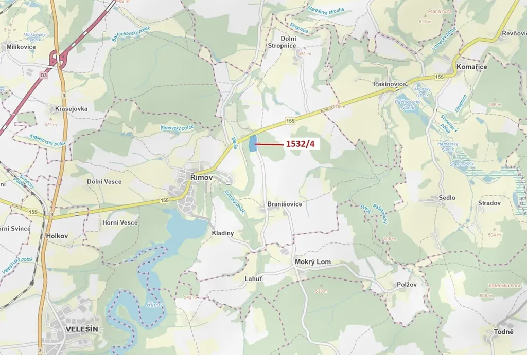 Lesní pozemek o výměře 34 065 m2, parcelní číslo 1532/4, podíl 1/1, katastrální území Dolní Stropnice, obec Římov, obec s rozšířenou působností České Budějovice, okres České Budějovice, Jihočeský kraj.