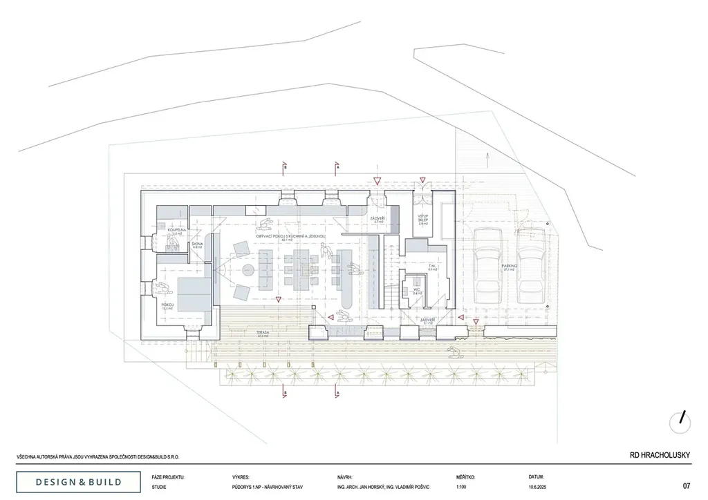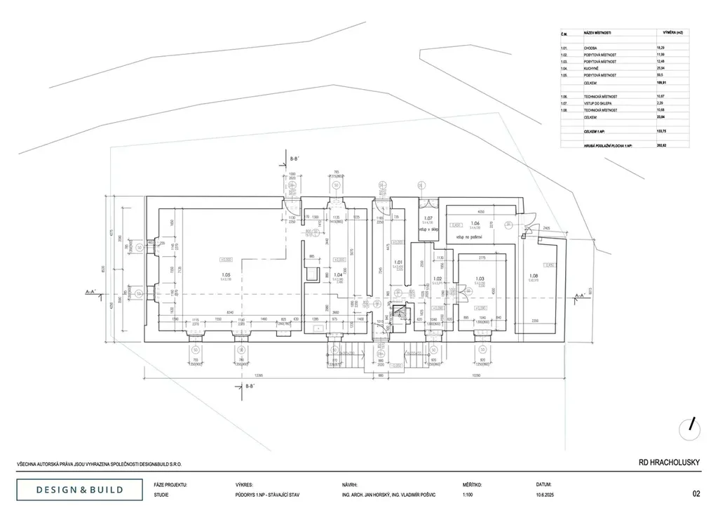 Užitná plocha tohoto rodinného domu činí v 1.NP 133 m2. K tomu je nad celým půdorysem půda a objekt má malý sklep. Jak je patrné z půdorysů studie, objekt umožní prostorově komfortní řešení přestavby.