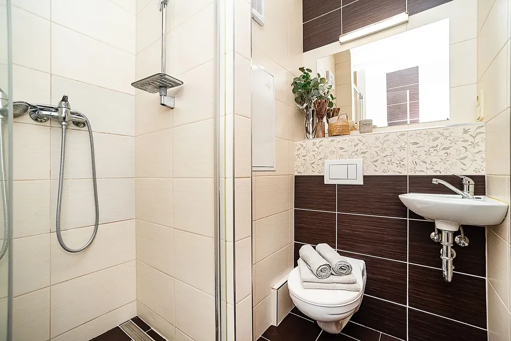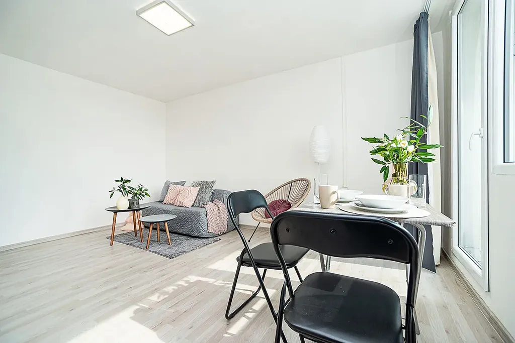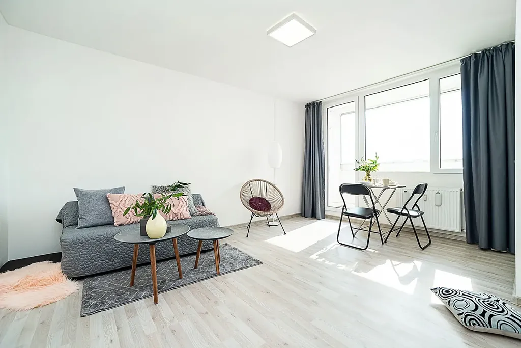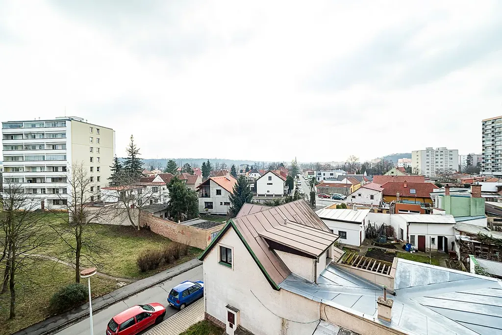 Z předsíně je vstup do koupelny a do hlavní obytné místnosti. Koupelna je vybavena kvalitními obklady, sprchovým koutem, toaletou, umyvadlem a přípojkou na pračku. Obývací pokoj působí díky velkým plastovým oknům mimořádně vzdušně a svěže. V okolí nejsou žádná protilehlá okna, takže si užijete naprosté soukromí i příjemný výhled. Z pokoje je vstup na zasklenou lodžii, která se skvěle hodí k posezení, pěstování rostlin nebo sušení prádla.