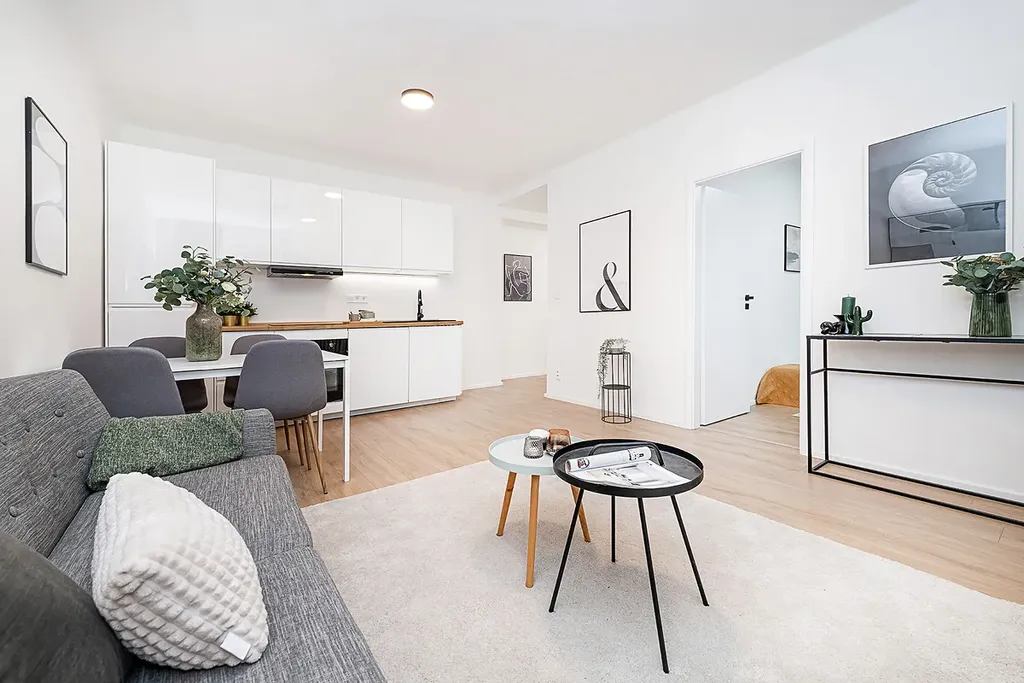 Dispozici bytu tvoří dvě neprůchozí ložnice, velkorysý obývací pokoj spojený s kuchyní, prostorná koupelna se sprchovým koutem a samostatný záchod.