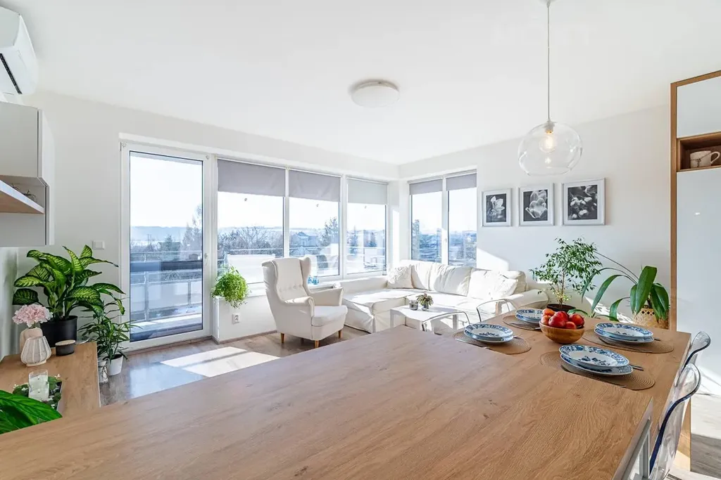 Interiér je řešen ve vysokém standardu s důrazem na pohodlí a funkčnost. Praktická kuchyňská linka s vestavěnými spotřebiči a nábytek na míru v obývacím pokoji jsou součástí prodeje, Podlahové vytápění s vinylovou podlahou a velká okna vytvářejí harmonický celek, ve kterém nic neruší a vše má své místo. Byt působí klidně, moderně a zároveň velmi útulně. O příjemnou teplotu v bytě se stará klimatizace.