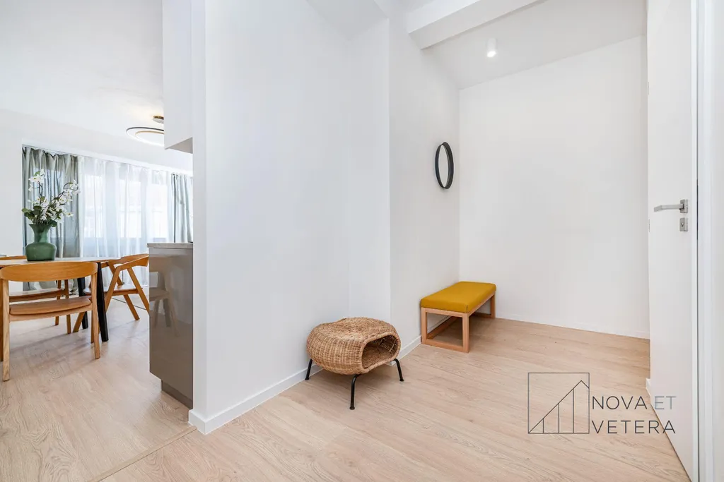 Byt právě prošel kompletní rekonstrukcí, která zahrnuje nové rozvody elektřiny, vody a odpadů, moderní podlahové krytiny, nové obklady a sanitu, interiérové dveře i celkovou obnovu vybavení. Součástí standardu je také kuchyňská linka se značkovými spotřebiči značky Gorenje s pětiletou zárukou.