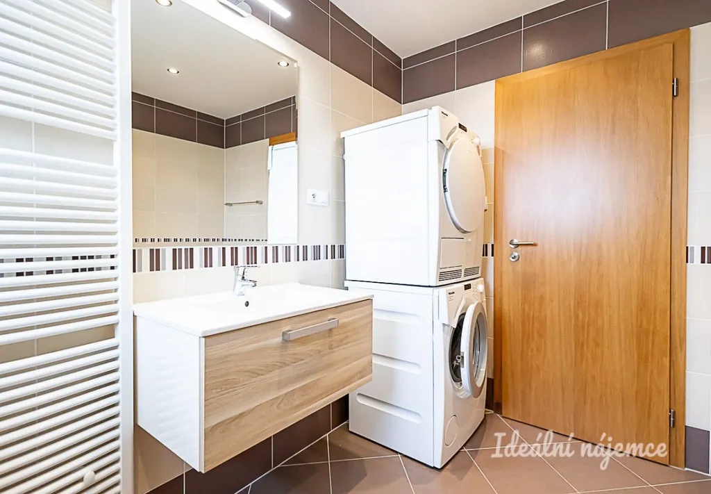 Interiér je nabízen jako částečně vybavený, což budoucím nájemníkům poskytuje ideální prostor pro zařízení domova podle vlastního vkusu. Srdcem bytu je obývací pokoj s pohodlnou sedací soupravou, na který plynule navazuje moderní kuchyňský kout. Ten je kompletně osazen spotřebiči včetně lednice s mrazákem, elektrické trouby, varné desky, digestoře a myčky nádobí. Samostatná ložnice zajišťuje klidovou zónu pro odpočinek. V koupelně s vanou a umyvadlem je pro maximální komfort k dispozici také pračka a sušička.