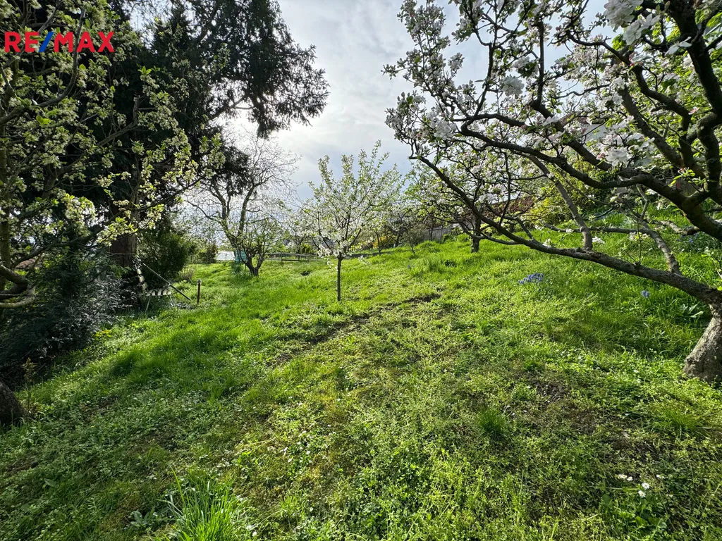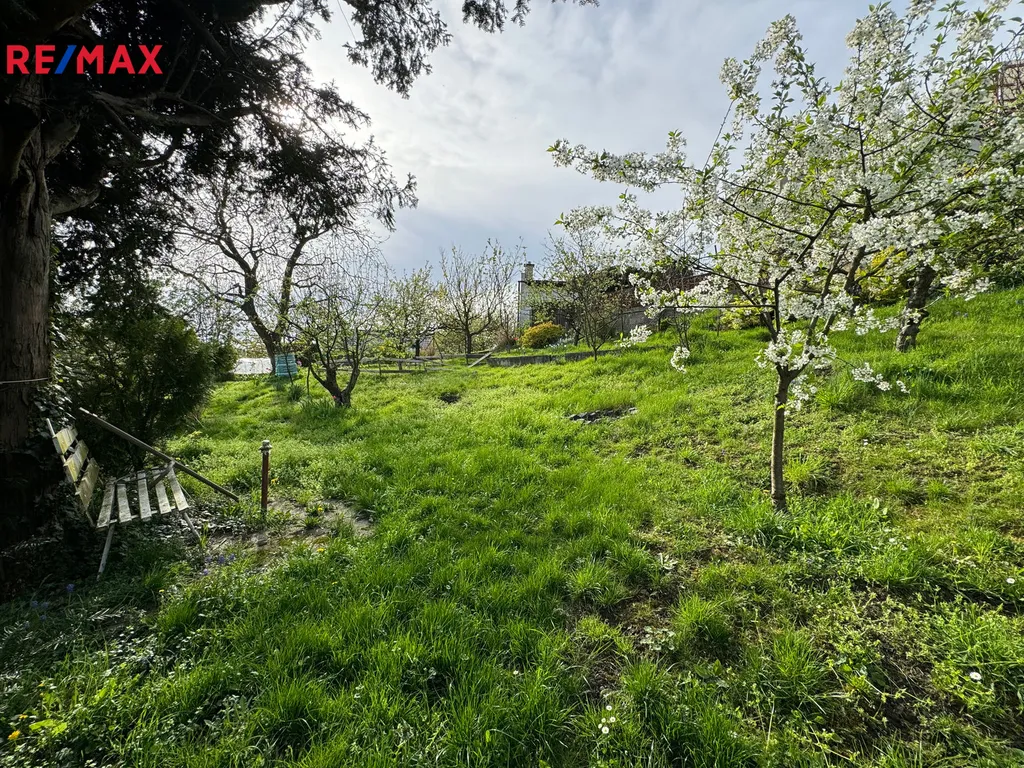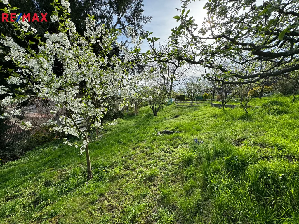 Z horní části zahrady je nádherný výhled do okolí. Na zahradě jsou ovocné stromy, okrasné keře a další okrasné květiny.