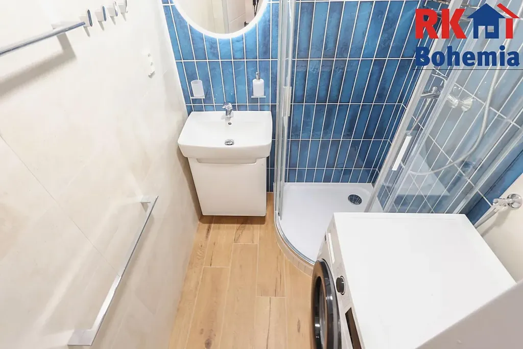 nová zděná koupelna + samostatné WC, pračka