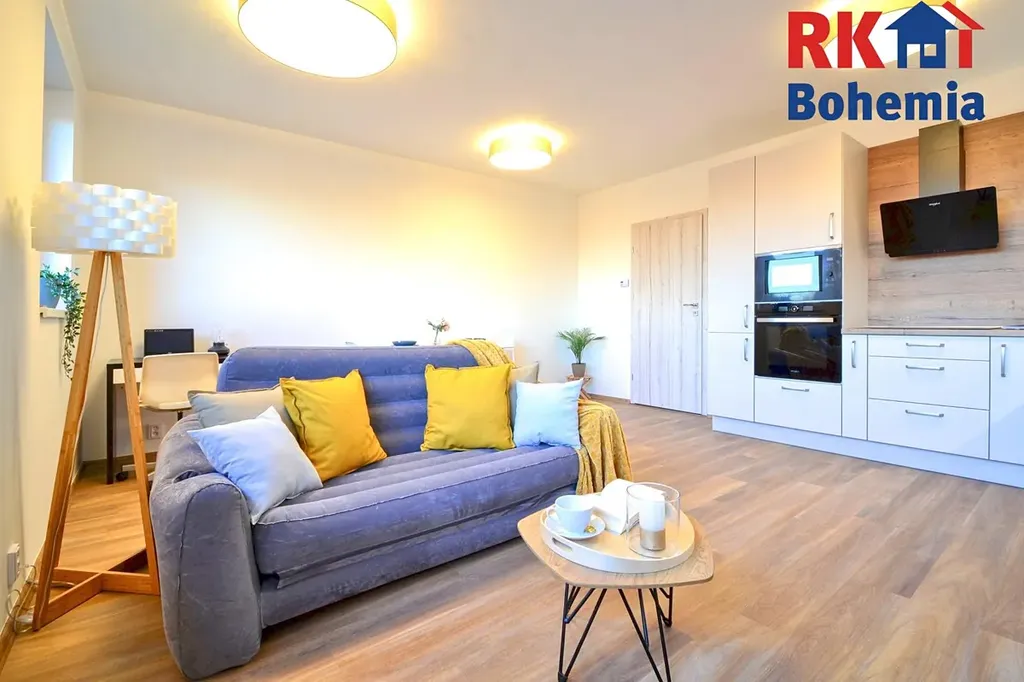 Hlavní obytná místnost bytu je velice výhodně prostorově řešena. Podlaha v obytné místnosti a v zádveří je řešena vinylovou podlahou, v koupelně je dlažba. Jednotlivé dekory a barvy, které jsou použity k vybavení bytu, navozují příjemnou a útulnou atmosféru. Volně stojící nábytek a dekorace na fotografiích nejsou součástí pronájmu.