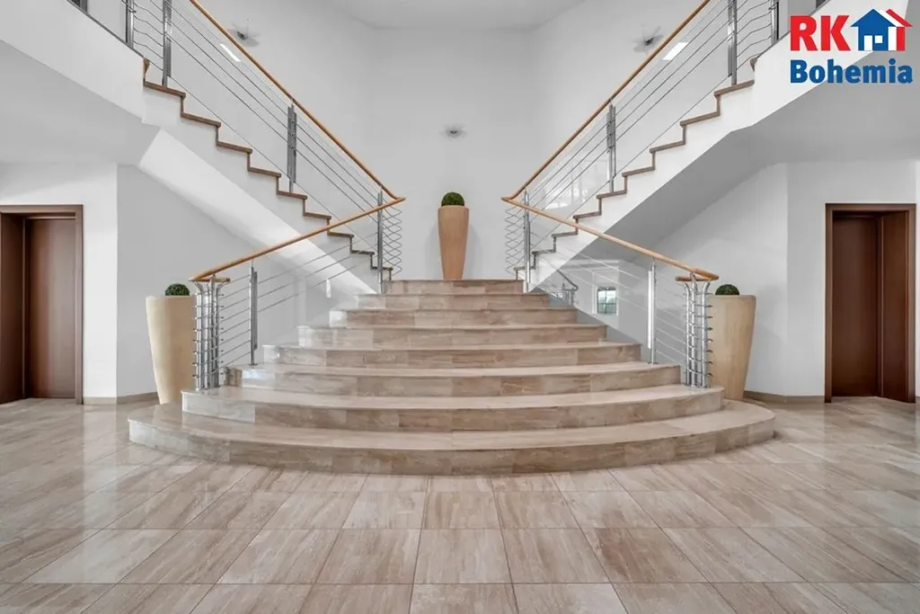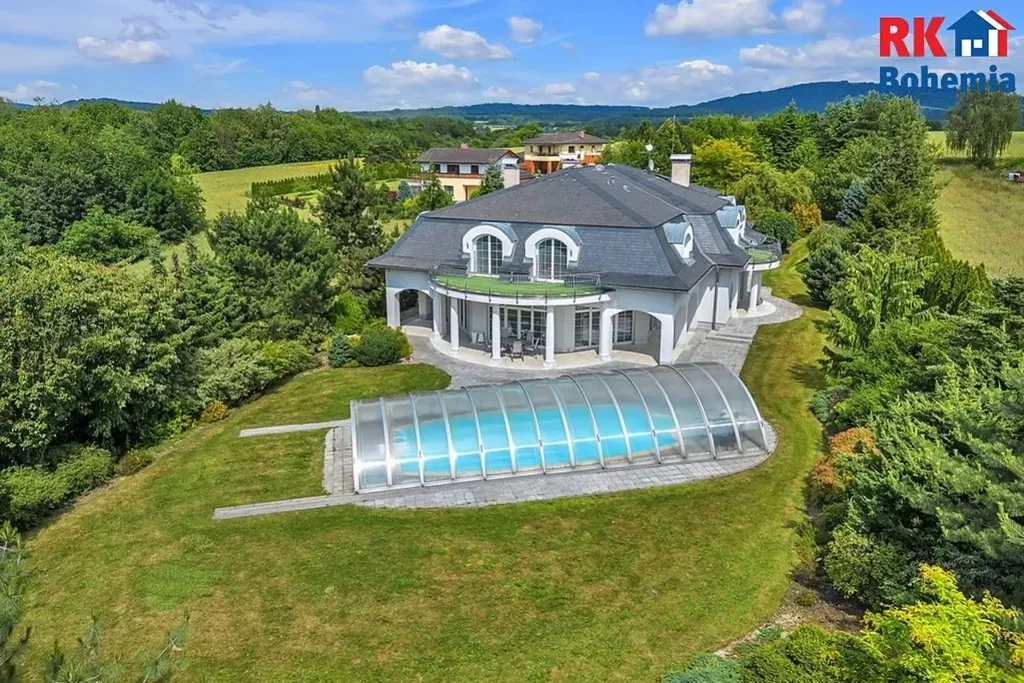 Bonusem je velmi citlivě upravená zahrada ze zavlažováním, se vzrostlými stromy a s travnatou plochou na heliport či tenisové kurty. Pozemek s vyhřívaným krytým bazénem a jezírkem velmi dobře doplňuje výjimečnost samotné stavby. Může sloužit pro rodinnou relaxaci a odpočinek a rovněž dokáže nabídnout potenciál v případě komerčního využití.
