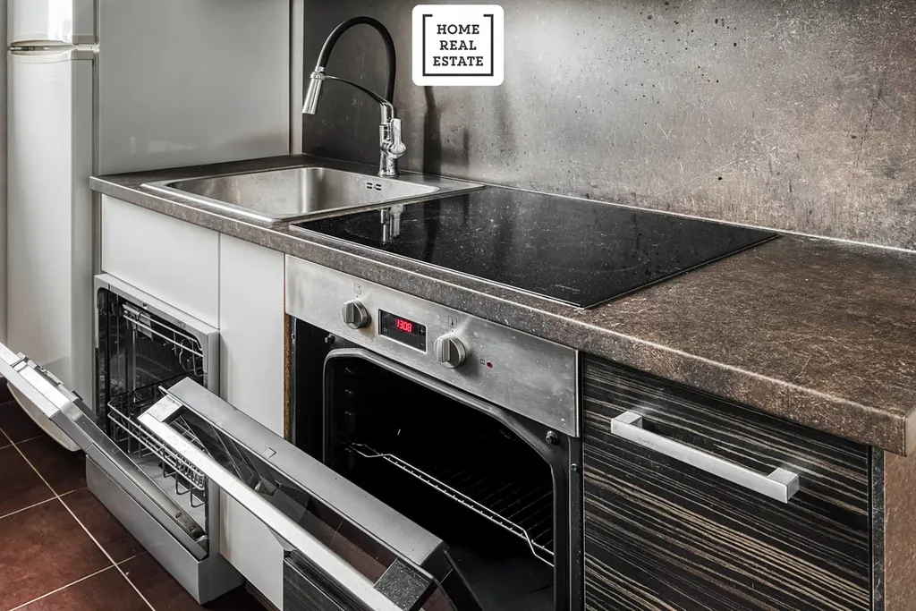 - kuchyní obsahující ledničku, myčku na nádobí, varnou desku, troubu a digestoř