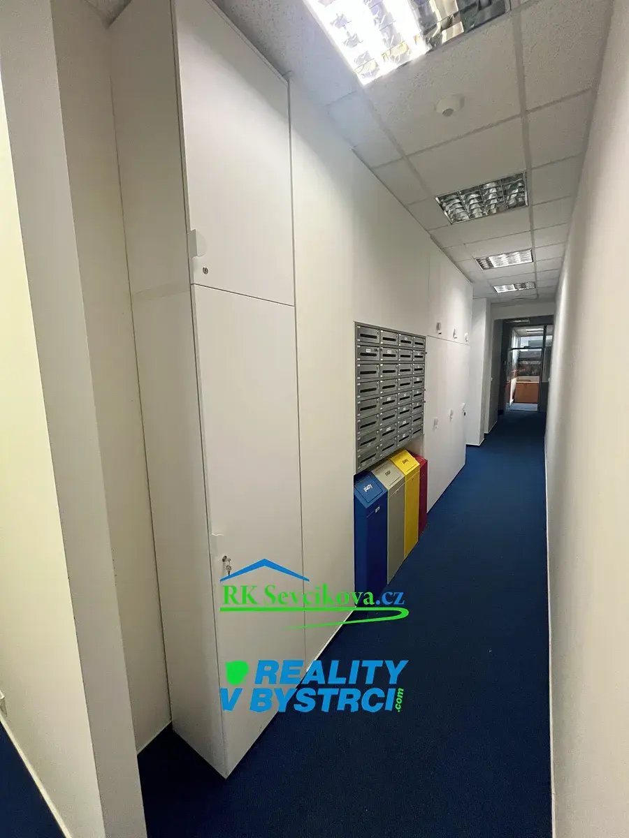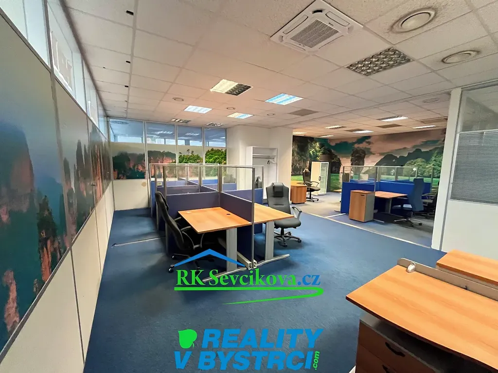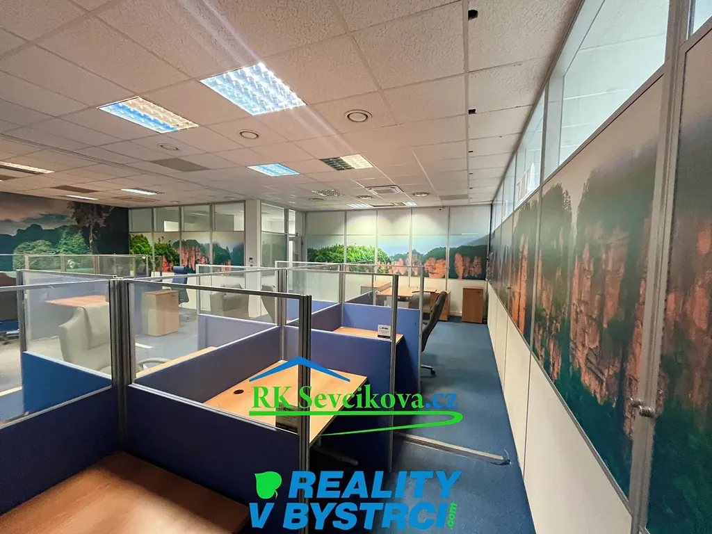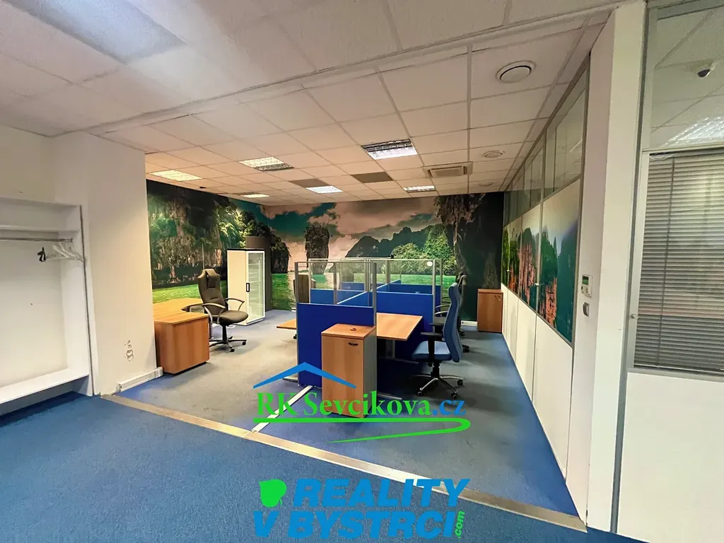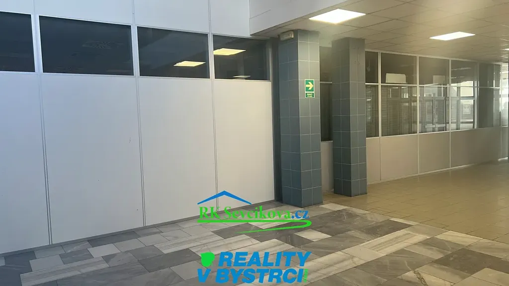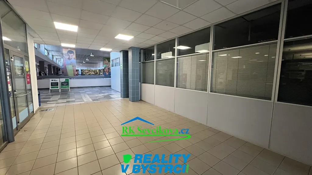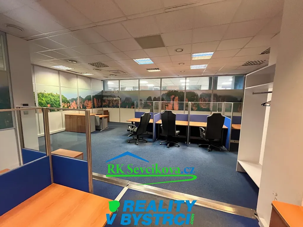 Místnost je vybavena kancelářským nábytkem, kobercem, výlohami. Možnost propojení dveřmi s obchodní částí komplexu.