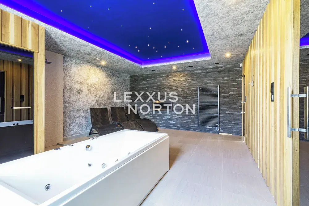 Vstupní chodba je vybavena vestavěnými skříněmi. Kuchyňský kout nabízí kompletní vybavení včetně indukční varné desky, trouby, americké lednice, myčky nádobí, mikrovlnné trouby a odsavače par. K ložnici v přízemí náleží vlastní koupelna se sprchovým koutem a šatna. Komora je vybavena regálovým systémem, který poskytuje dostatek úložného prostoru. V prvním patře se nachází hlavní ložnice se šatnou a vlastní koupelnou se sprchovým koutem. Další ložnice jsou vybaveny vestavěnými skříněmi. Koupelna na patře disponuje vanou a v samostatné prádelně je připravena instalace pro pračku a sušičku. Na zahradě se nachází vyhřívaný bazén se zastřešením. V celé nemovitosti je instalováno podlahové vytápění. Dům je dále vybaven vstupní bránou s dálkovým ovládáním, zabezpečovacím alarmem, kamerovým systémem, vysokorychlostním internetem s rozvody po celém domě a centrálním vysavačem značky Husky.