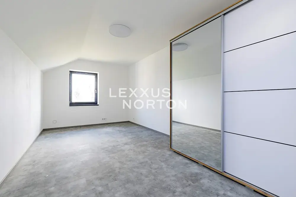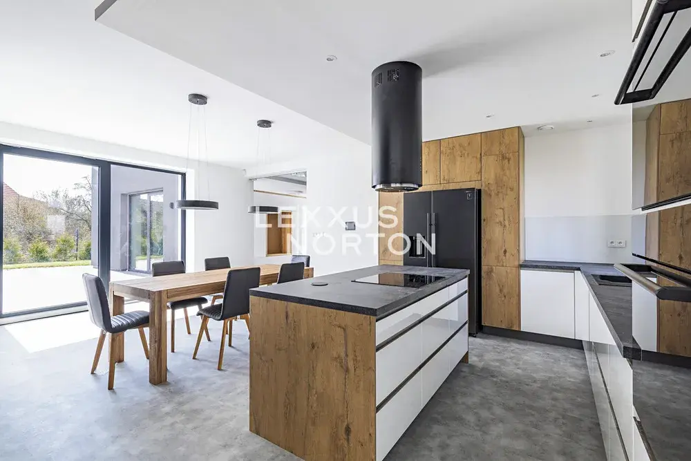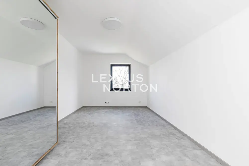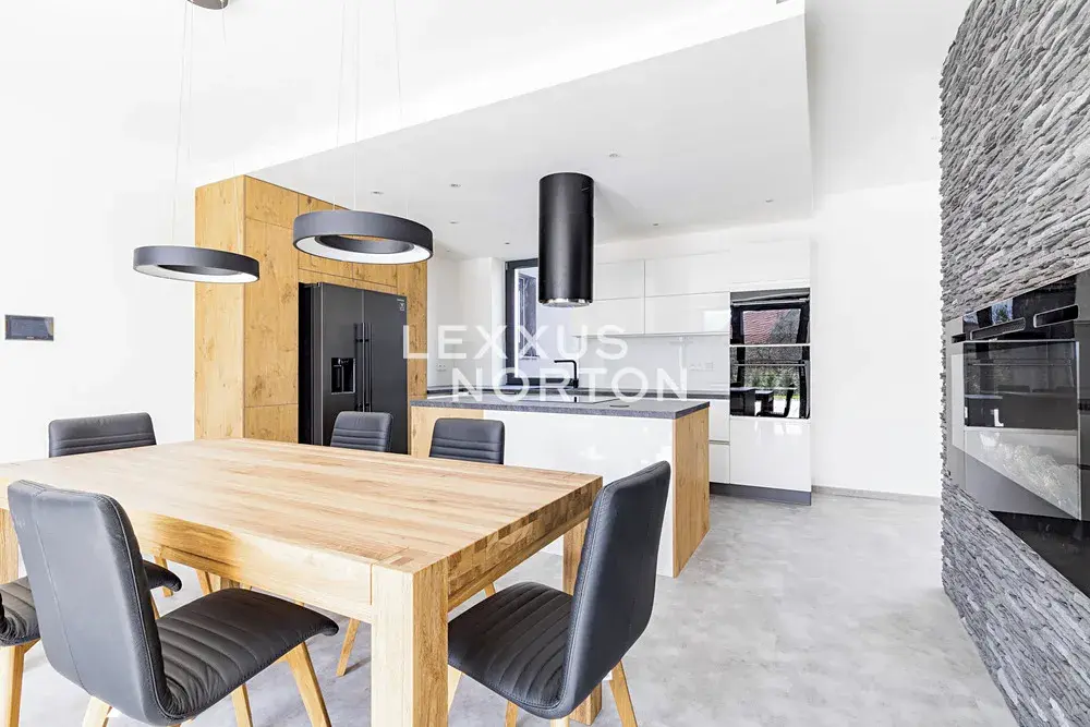 Tento rodinný dům k pronájmu se skládá ze 2 podlaží. V přízemí se nachází vstupní hala, obývací pokoj s krbem a přímým vstupem na terasu a do zahrady, kuchyňský kout s kuchyňským ostrůvkem propojený s jídelní částí, ložnice, samostatná toaleta, technická místnost, komora a relaxační spa & wellness zóna se saunou a masážní vanou. V prvním patře jsou situovány 3 ložnice, koupelna a prádelna. K nemovitosti náleží garáž pro dvě vozidla a jedno kryté venkovní parkovací stání.