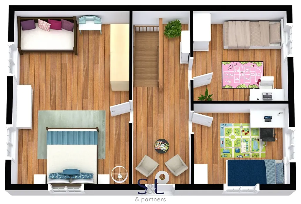 V patře jsou tři podkrovní pokoje. Nad obytnou částí je k dispozici ještě půda s pevnou podlahou, vhodná jako úložný prostor nebo k dalšímu využití.