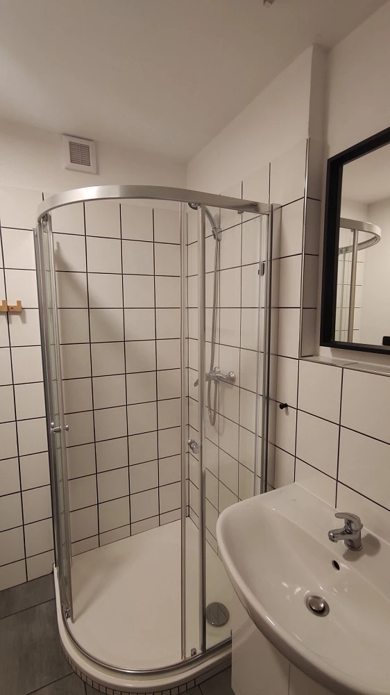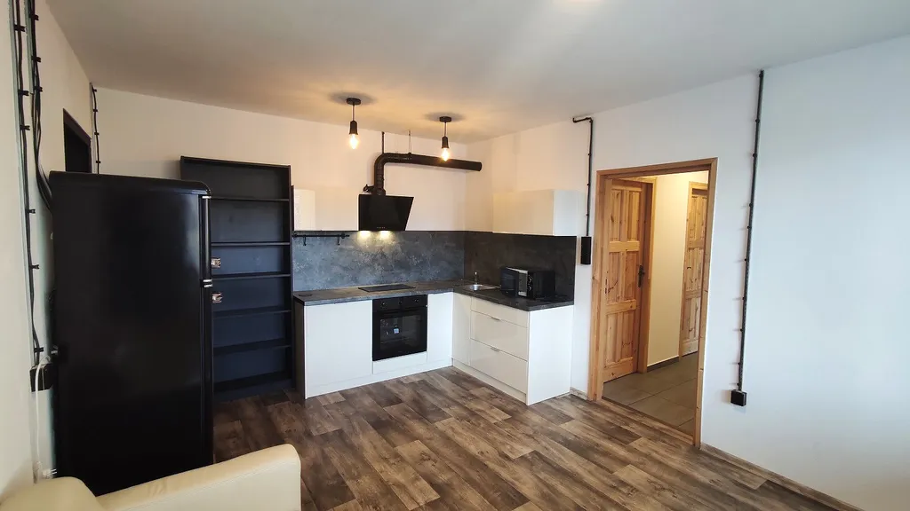 Interiér bytu má atypickou dispozici a působí velmi vzdušně a čistě. Kontrast černých prvků a designových doplňků podtrhuje industriální charakter bytu. Kuchyňská linka je plně vybavena. K dispozici je varná deska s digestoří, klasická i mikrovlnná trouba.