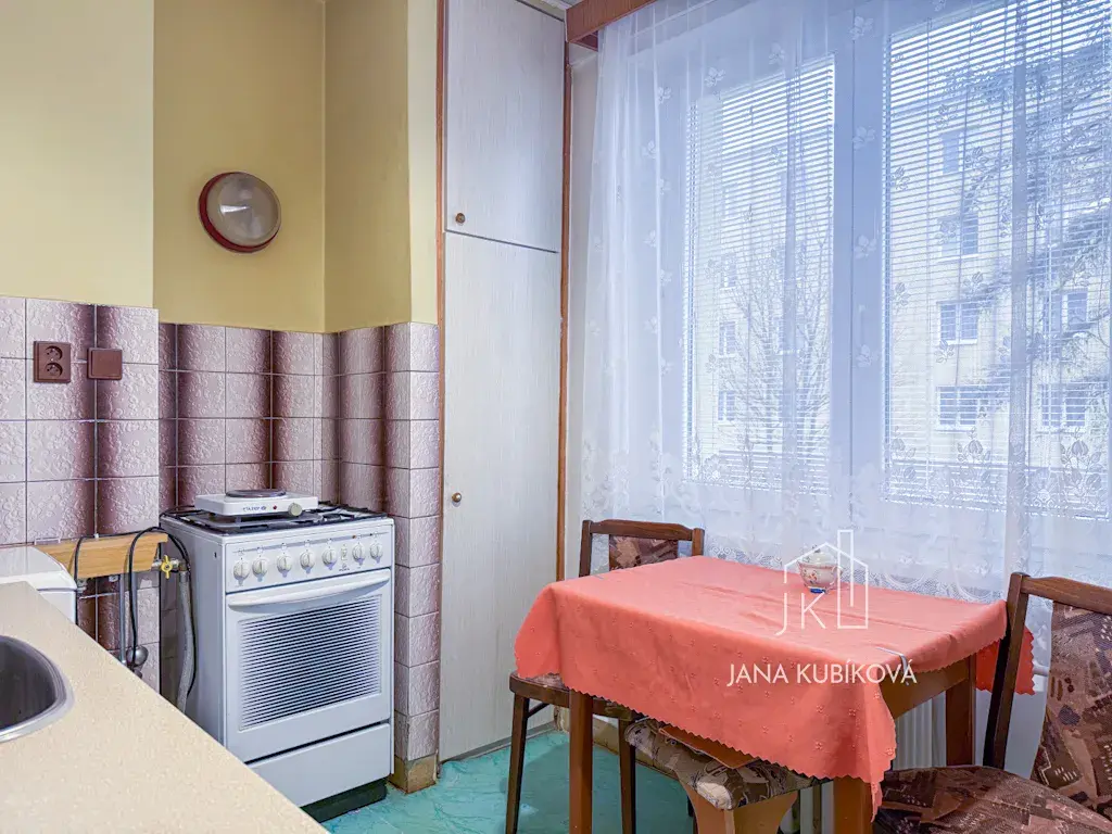 Z chodby je dále přístupná kuchyně s jídelním koutem, která plynule navazuje na obytný prostor. Současně je z chodby vstup do obývacího pokoje se vstupem na balkon a do dalšího samostatného pokoje, vhodného jako ložnice či dětský pokoj.
