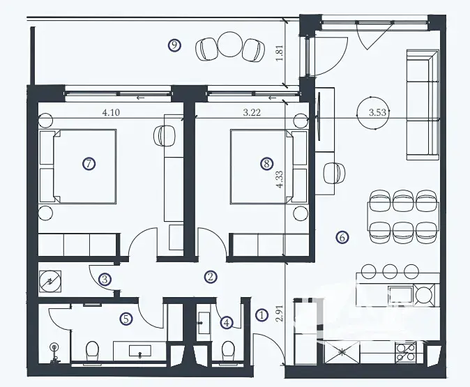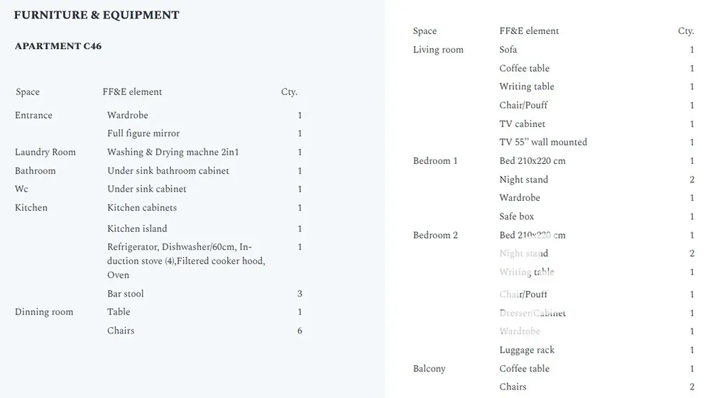 Celková plocha jednotky činí 95,5 m², k níž náleží prostorná terasa o velikosti 12,20 m² s úchvatným výhledem bazén. Interiér je kompletně vybaven moderním, kvalitním nábytkem, který podtrhuje styl i komfort bydlení.