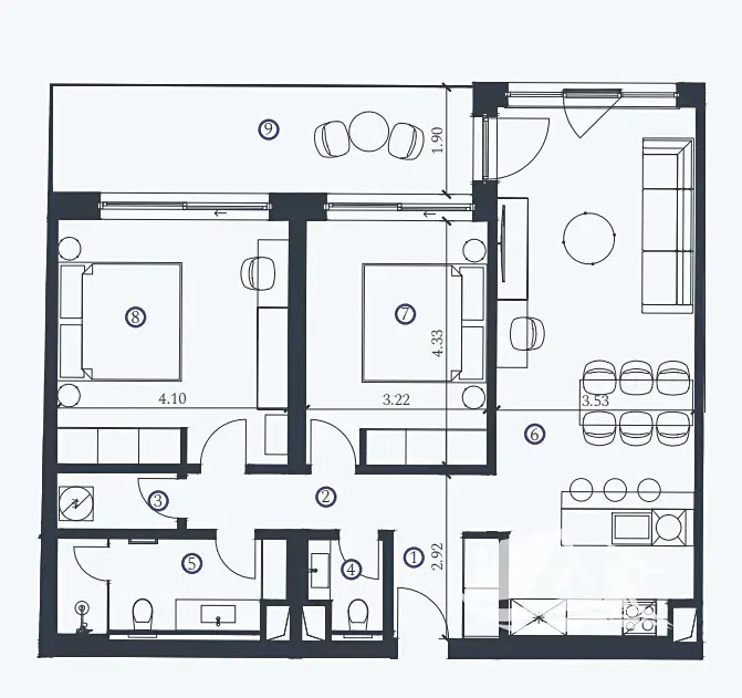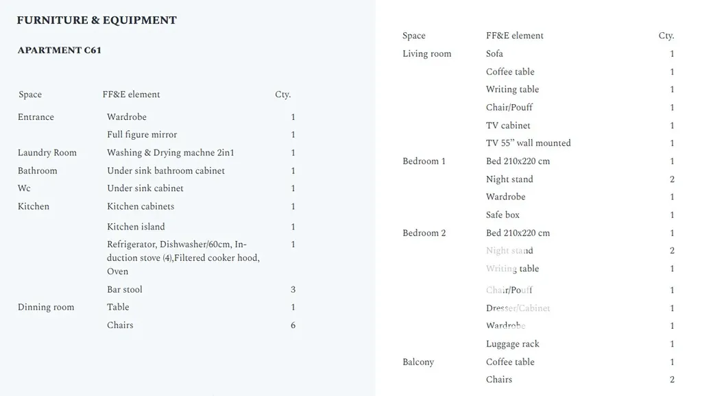 Celková plocha jednotky činí 97,3 m², k níž náleží prostorná terasa o velikosti 14,00 m² s úchvatným výhledem na Jaderské moře. Interiér je kompletně vybaven moderním, kvalitním nábytkem, který podtrhuje styl i komfort bydlení.